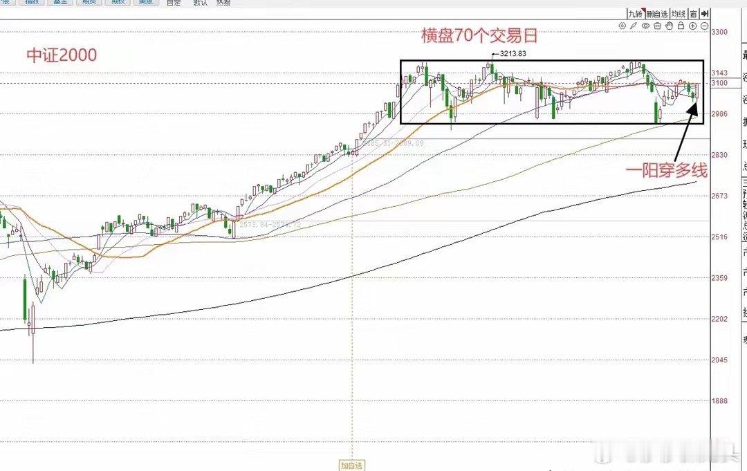 十二月五号收评: A股如期上涨,今天是否短线起涨点?莎莎今天漂亮拿下一局从今天市场收盘的情况来看,与我昨天收盘之后的,对于市场走势的预判基本一致。大家请看图一莎莎昨天晚上更新的,关于今天走势的手绘预测图。这一幅图与今天市场的走势还是颇为相似的。我想这一幅图打90分应该是完全没有问题的。今天老手不容易,顶住市场持续冰点情绪的压力,大胆判断今天市场会走出阳线反包,可以说是漂亮的拿下了一局。那么回到问题的重点,今天上证指数的这个低开走高的,站上5日均线的阳线,是不是短线的起涨点呢?在这里明确观点,莎莎今天成为短线上涨行情的开始是完全没有问题的,也就是说今天成为起涨点是完全没有问题的。为什么这么说?有三个具体理由第一,昨天收盘之后我就明确告诉大家,昨天市场三市的成交额只有1.56万亿,这代表了短期市场的绝对地量已经出现,而且昨天是收出的标准十字星地量,再加上十字星,这就成为短线最明确的,最经典的止跌信号。十字星之后,今天出现了放量阳线的上涨,这代表了对昨天止跌信号的再一次确认,所以今天的上涨,很有可能是波段上涨的开始。第二,今天三大指数量价齐升,而且上穿了多条重要均线。以上证指数为例,上证指数今天从5日,10均线的下方上穿了5日、10日均线,这两条重要均线是短期重要的压力,但是今天已经完全突破,并且是带量突破。所以这是技术面上的强劲的信号!第三,代表小的个股走势的中证2000指数,今天的短线信号都为强劲。中证2000指数今天走出了一阳穿多线的强力走势,并且中证2000指数,自从上一个上涨波段之后,已经在高位横盘了70个交易日,而今天在横向箱体的右手边出现这种强力k线,很有可能意味着中证2000指数或者还能小幅度的往上走出创新高的行情大家请看图二。所以,今天收盘之后,对于接下来指数的走势,我维持比较乐观的判断,莎莎接下来指数很可能处在波段上涨的起点。今天的收盘点评和大家说这么多。操作上莎莎早上从博纳影业减了三分一仓出来去补科翔股份做踢,奈何只踢了一个多点,下午科翔股份猛拉,关注莎莎朋友都知道莎莎昨天就提前跟大家说了今天会这样操作兄弟朋友们点赞就是对我这个纯技术派的最大支持,关于下周一走势的手绘预测图,我会在星期天上午更新,大家保持关注!