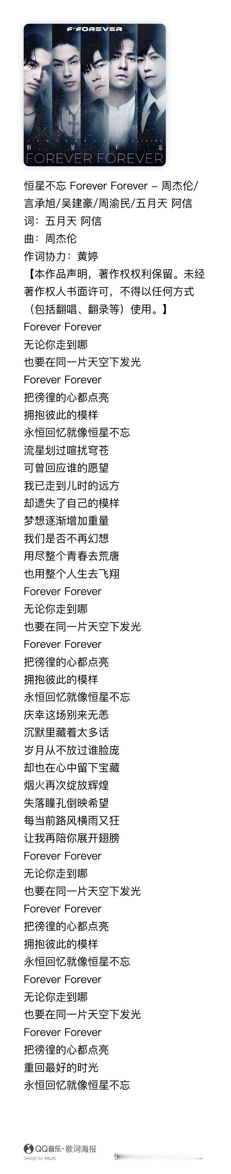 宇宙级最强恒星阵容梦幻合体 ——周杰伦 ╳ 言承旭 ╳ 吴建豪 ╳ 周渝民 ╳ 五月天阿信【 恒星不忘 ✦ Forever Forever 】周杰伦作曲|五月天 阿信作词神级阵容 世纪级联手携手写下前所未见的传奇新篇章别来无恙,无论你走到哪,也要在同一片天空下发光;是一眼瞬间的默契,是信念里成长的乐章。Forever, forever——五道闪耀光芒,穿透黑夜,绽放恒星不忘。 周杰伦阿信言承旭吴建豪周渝民新歌