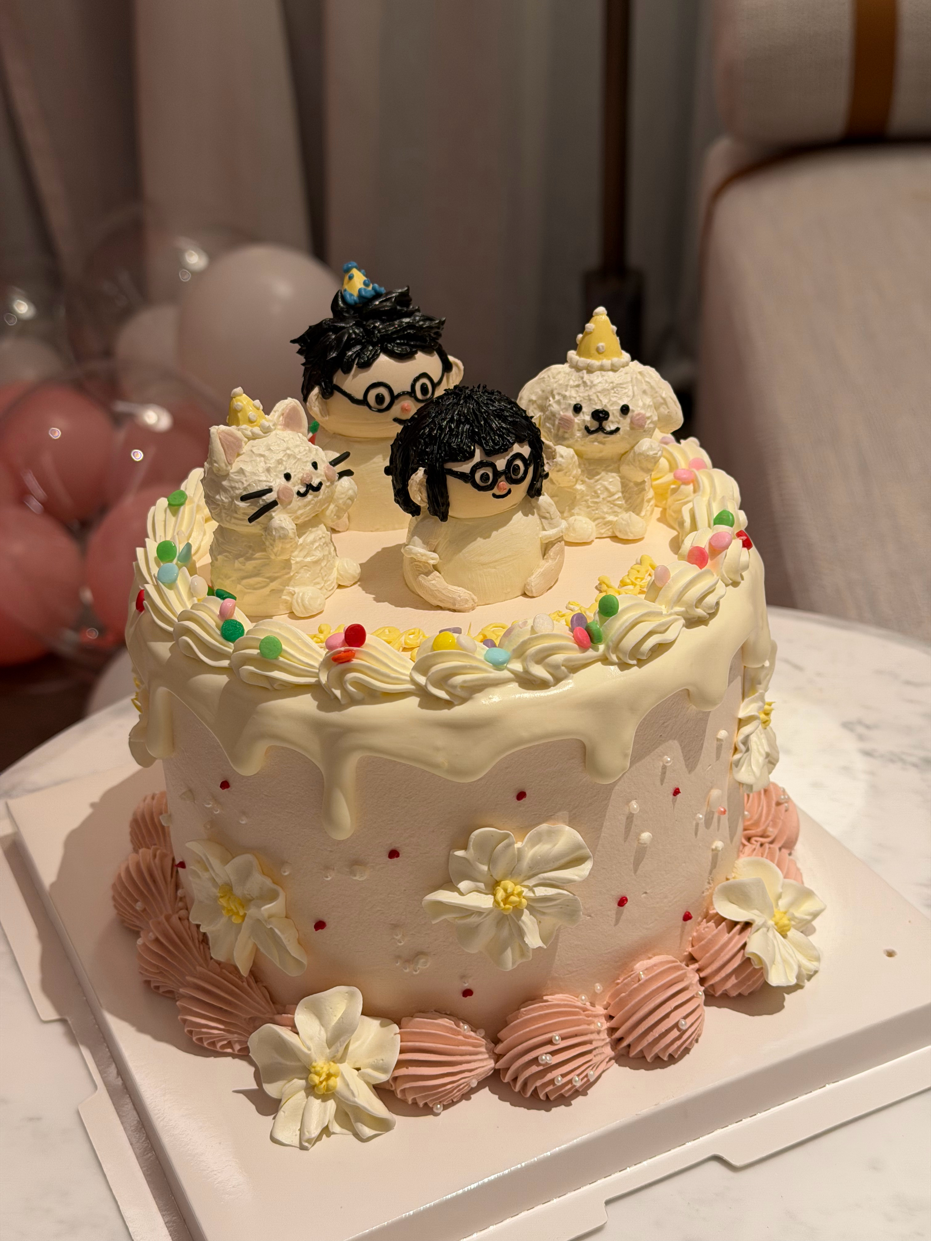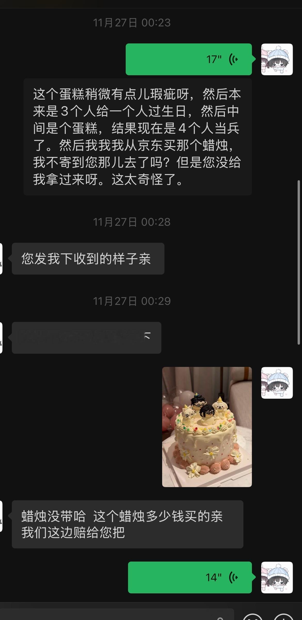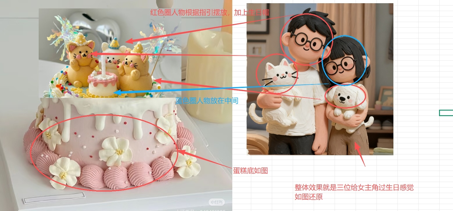 前两天女朋友生日,给女朋友设计的蛋糕。但是一整个大失败………图 1 图 2 是我心里的样式,跟蛋糕师也是这么传达的。图 3 是最后的成品……本来是我x猫x狗围在蛋糕前,给女友过生日的温馨场景。结果做成了我们三个是我女朋友的保镖的感觉………而且生日帽竟然戴在了我们三个的头上,我女朋友头上是空的最离谱的是,我京东买的好看蜡烛,让蛋糕店一起带给我,他忘了………失败
