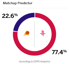 赛前,美媒ESPN预测本场比赛,火箭胜率77.4%,太阳胜率22.6%。