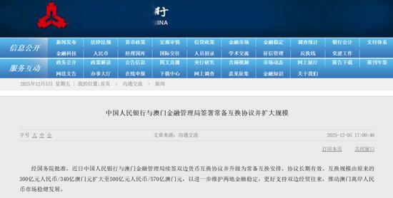 12月5日,中国人民银行官网显示,中国人民银行与澳门金融管理局签署常备互换协议并扩大规模。