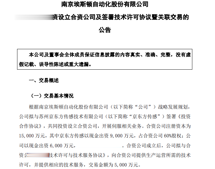 该合资公司注册资本为1.5亿元,其中京东方传感以现金出资9,000万元,占合资公司60%股权;埃斯顿以现金出资6,000万元,占合资公司40%股权。