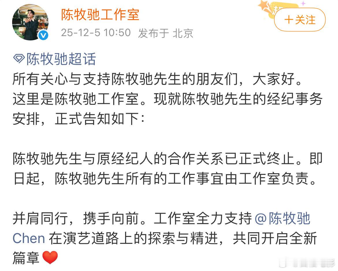 陈牧驰与经纪人合作终止 陈牧驰和经纪人不继续合作陈牧驰与经纪人合作终止!陈牧驰和经纪人不继续合作! 陈牧驰发文:“冬天,大概是个适合分别的季节。我和我经纪人伙伴,因业务调整,不再继续合作。后续工作统一由负责和推进。”