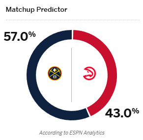 ESPN预测明日比赛:掘金胜率57%,老鹰胜率43%