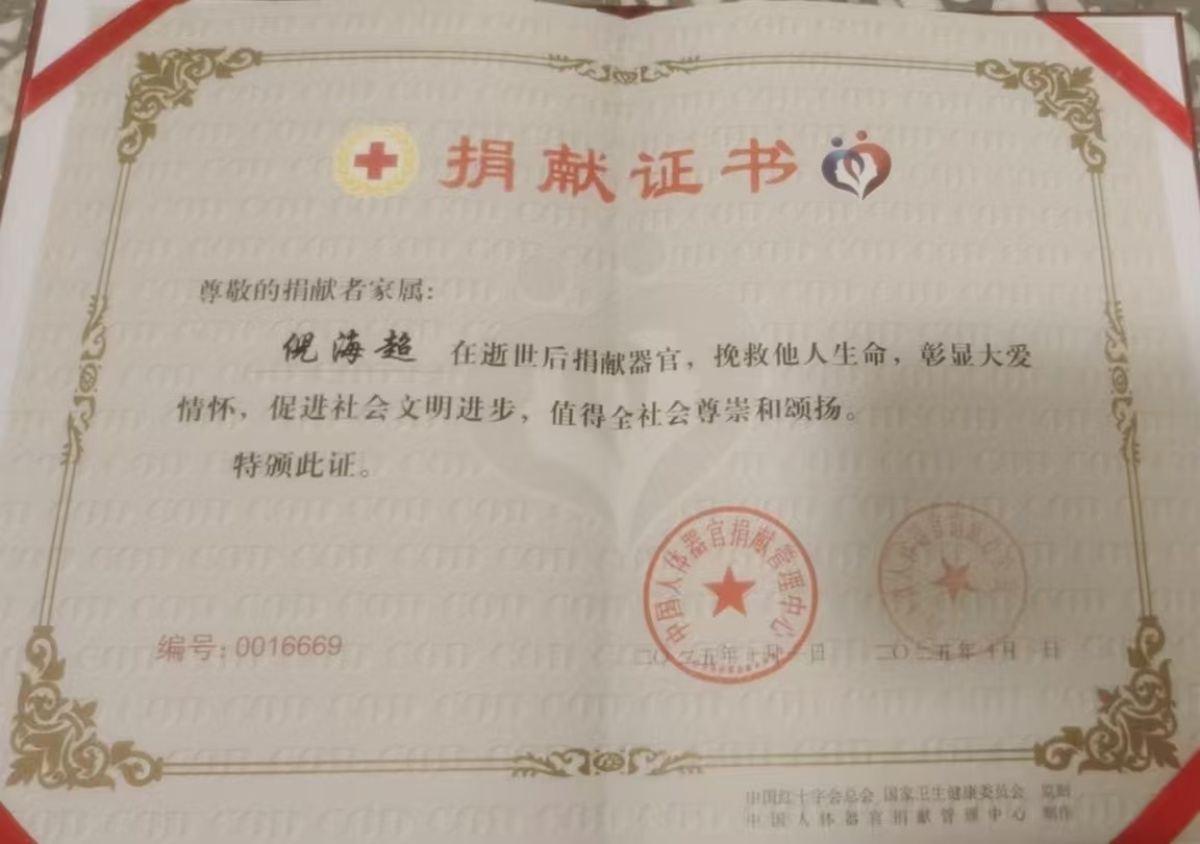 海超妈妈刘女士幼年丧母,中年丧夫,一场意外又让她失去了唯一的儿子……一连串的重创,对她的打击可想而知。然而,这位饱受苦难的妈妈,在得知儿子的生命无法挽回后,强忍悲痛,做出了捐献儿子的肝脏、双侧肾脏、肺脏和眼角膜的决定,帮助4名急需救助的器官衰竭患者重获新生,2名眼疾患者重见光明。