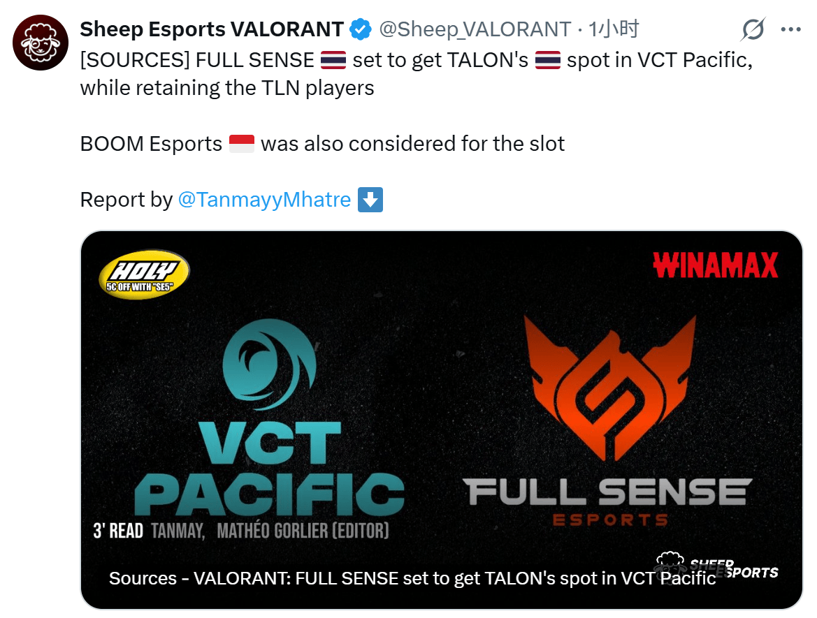 由于财务困境TLN了退出VCT太平洋联赛,拳头一直在积极寻找替代队伍。容斥原理,一支泰国队将取代另一支泰国队,FULLSENSE将以特邀参赛的身份加入联赛,并将保留TLN的原有阵容,并从自己的阵容里再提拔一名选手。