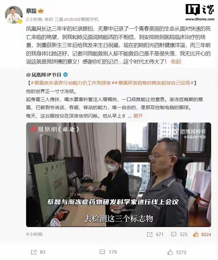 渐冻人蔡磊回应身体近况,已准备好尝试脑机接口 在这个科技飞速发展的时代,曾经被认为遥不可及的梦想正逐渐变成现实。近日,渐冻人蔡磊的一番话再次点燃了公众的希望与思考。他坦言,自己已经做好了迎接新科技的准备——尝试脑机接口。这不仅仅是个人的勇气,更是人类迈向未来的一个重要步伐。 蔡磊的故事,或许很多人都不陌生。他曾经用坚韧不拔的意志,面对身体的巨大挑战,从渐冻症的阴影中寻找光明。如今,他用行动告诉我们:生命的意义,不在于是否完美,而在于敢于突破极限,追求可能。这个决定,背后隐藏着怎样的勇气?又折射出怎样的人性光辉?或许,他在用自己的经历告诉我们:无论命运多么残酷,只要心怀希望,就有无限可能。 脑机接口,这个曾经只在科幻电影中出现的概念,正逐步走入现实。它不仅代表着科技的突破,更象征着人类对生命极限的不断挑战。蔡磊的勇敢尝试,或许会成为未来无数像他一样的“勇士”的希望之光。我们不禁要问:科技的边界究竟在哪里?它能否真正带来救赎?更重要的是,我们每个人都能从中汲取什么力量? 有人说,科技的进步让我们变得越来越冷漠,越来越依赖机器,逐渐失去了人性中的温度。但蔡磊的选择,恰恰证明了:科技不是冷冰冰的工具,而是赋予人类希望的火种。它让我们相信,无论身处何种困境,只要有勇气去尝试,就有改变的可能。这种精神,才是真正的正能量。 或许,未来的某一天,我们每个人都能像蔡磊一样,勇敢面对生命的挑战,用科技点亮生命的每一个角落。那时,我们会发现,所谓的“极限”,其实只是我们还未探索的边界。而真正的奇迹,正等待着我们去创造。 所以,当你看到蔡磊的故事,不要只看到一个渐冻人的坚韧,更要看到那份敢于突破的勇气。也许,我们每个人都能从中汲取一份力量——那就是:只要心怀希望,未来就没有什么不可能。蔡冻症 蔡磊寄语年轻人