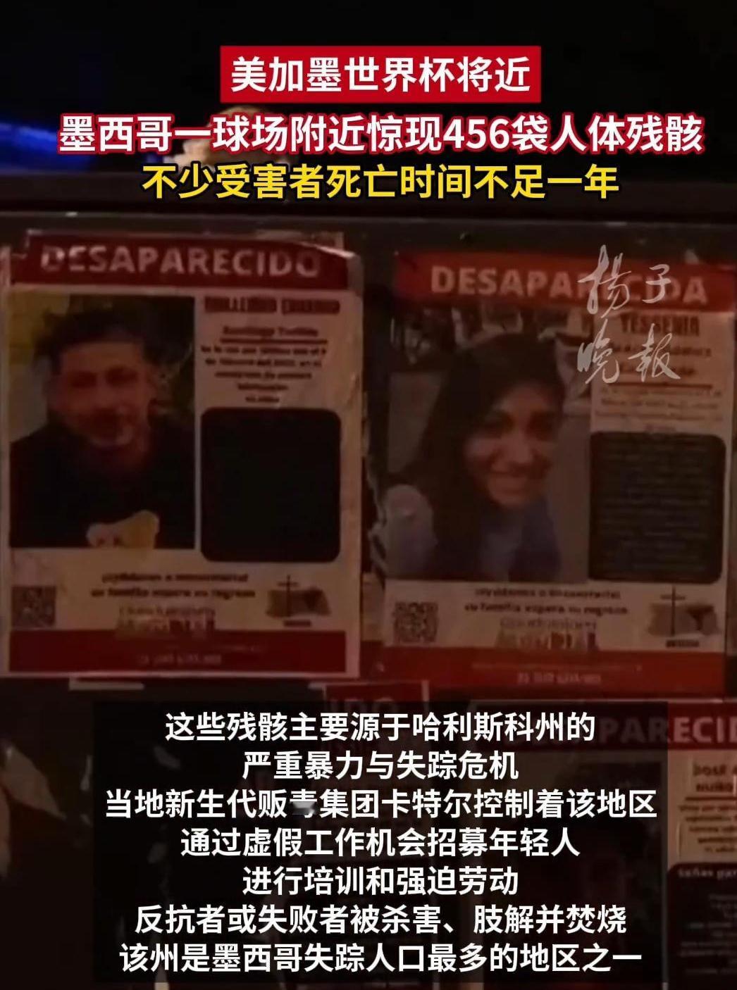 毛骨悚然!世界杯墨西哥主会场附近陆续发现456袋碎尸,不少受害者死亡时间不足一年,想想鸡皮疙瘩都掉了一地。 2026年世界杯主会场有3个,一个美国一个加拿大一个墨西哥,前两个还算安全,第三个墨西哥那可是毒贩的老窝啊。 这些残骸主要源自于哈利斯科州的严重暴力和失踪危机,那里有新生代的贩毒集团控制着这个地区,从2022年开始主会场附近10到20公里陆续出现完整尸体、肢解尸体和碎片骨骼。 这些人大多数都是 没骗来工作的年轻人,贩毒集团对他们进行培训和强迫劳动,他们反抗后被杀害。 这么恐怖的地方,球员来了估计也没心情踢球吧,但国际足联和墨西哥政府不听啊,坚持用这个球场。 不过不用为我们的国足担心了,他们明年不去,没有生命危险。