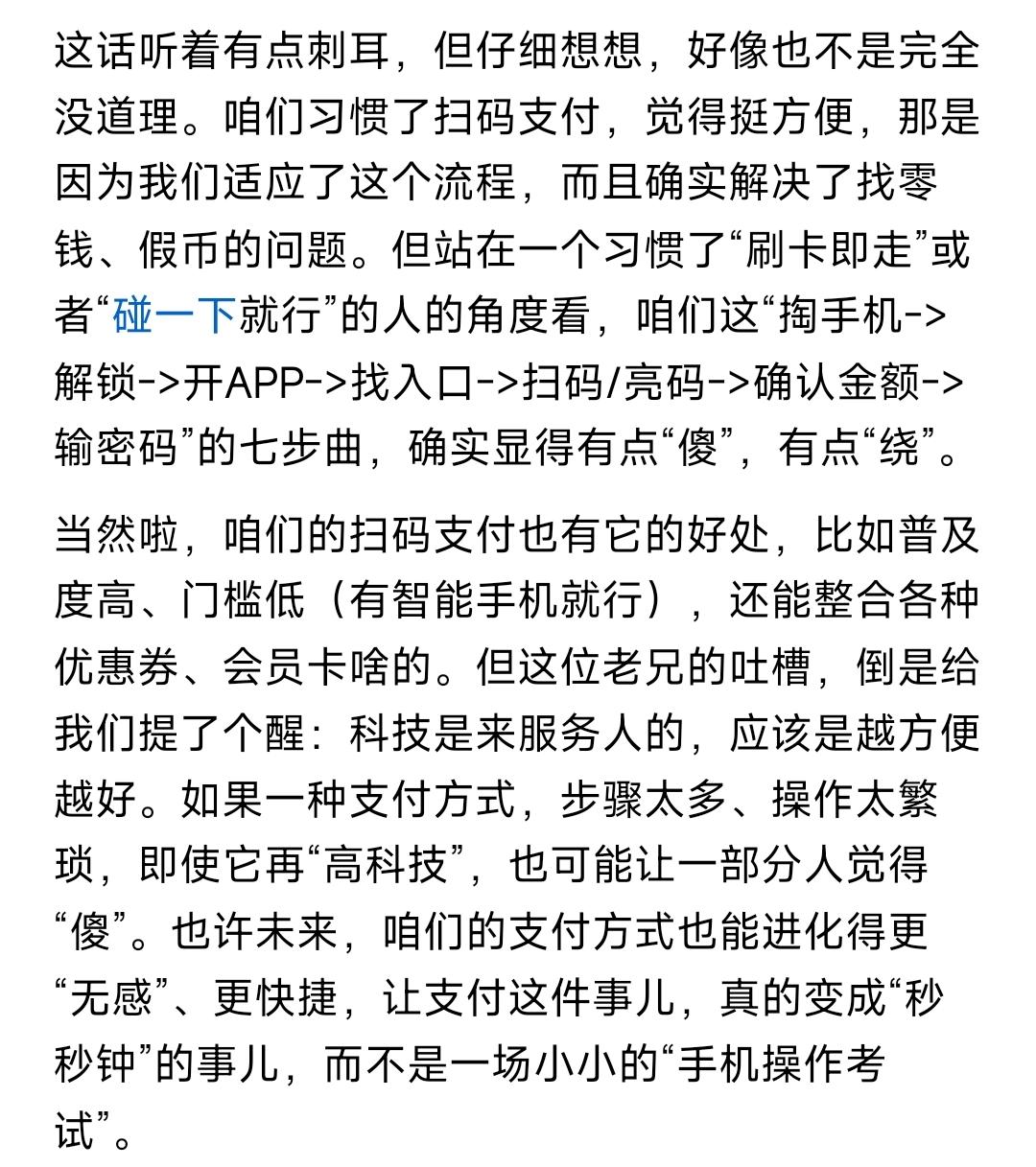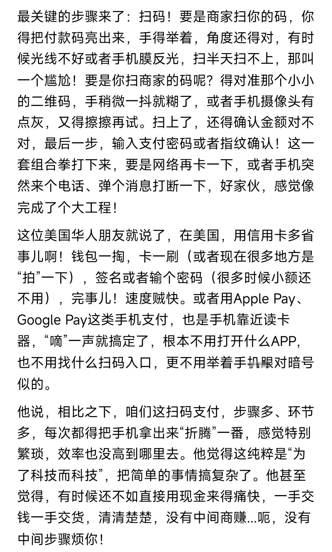 这就是典型的先花靶再射箭。为了论证美国信用卡支付比中国移动支付好,就硬生生把移动支付分解成一个个掏手机,开手机这种具体步骤,对刷信用卡就总结成卡一刷,老美也不是把信用卡焊手上的啊。最后还整一波理中客,去总结说信用卡好。说白了,要是两边使用颠倒一下,那肯定又是要论证移动支付比信用卡好了。
