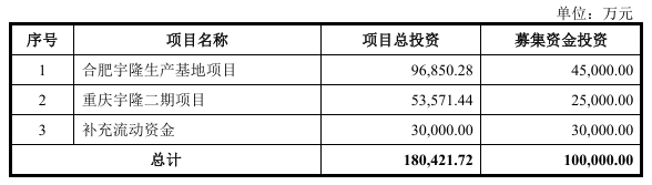根据招股书,本次募集资金将投入于合肥宇隆生产基地项目、重庆宇隆二期项目,及补充流动资金。