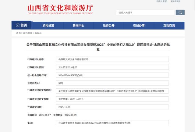 关于同意山西致其知文化传播有限公司举办周华健2026”少年的奇幻之旅3.0”巡回演唱会-太原站的批复