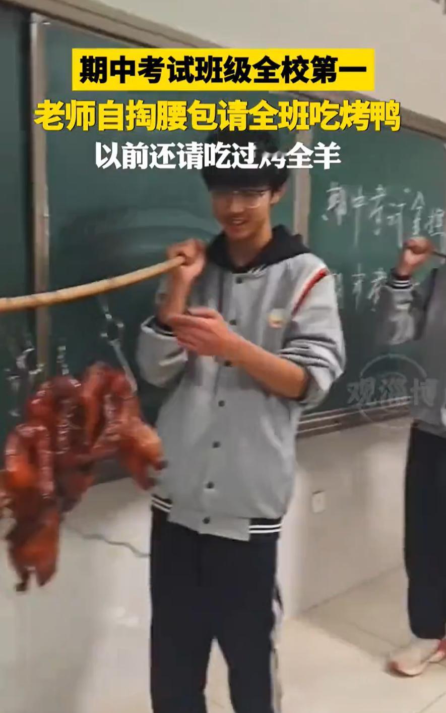“这位老师火了!”山东,一位男老师在期中考试成绩公布后,严肃的来到班级讲台前开会,同学们都以为是考得不好要挨批评了,结果却突然反转,原来这次班级考到了全校第一,老师一高兴,直接自掏腰包请全班同学吃烤鸭 其实,班级考了全校第一这个消息,他一早就知道了,不过并没有第一时间告诉同学们,想着给他们一个惊喜,于是提早订了烤鸭,然后就提前告知了几位同学,让他们过来运输烤鸭 进教室前,他还想着略微吓唬一下这群娃。老师站上讲台,扫视了一圈,清了清嗓子,声音听不出情绪:“这次期中考试的成绩,大家都知道了。” 底下更静了,有几个学生已经悄悄攥紧了手 “我们班这次,”老师顿了顿,故意拖长了声音,“整体表现……” 他忽然停住,看着学生们紧张的神情,嘴角似乎绷得更紧了。可下一秒,他的语调猛地一扬,像是憋不住的高兴从声音里跳了出来:“考了全校第一!” 此话一出,班级一片欢呼,他顺手冲门外吼了一句:小的们把烤鸭抬上来,厅里瞬间乱成了开心的蜂窝,两个人一组往教室抬烤鸭,香味压都压不住 说实话,一份烤鸭并不贵,但一个班级的烤鸭,可不便宜,对一个普通老师来说,这不是顺手买杯奶茶的级别,是要掂量一下钱包的支出 也正因为这样,这件事才显得更有分量,他愿意花钱,是因为他认可学生的努力,而学生们也喜欢这种感觉,属于是双向奔赴的美好 班级考全校第一 历史老师请吃烤鸭