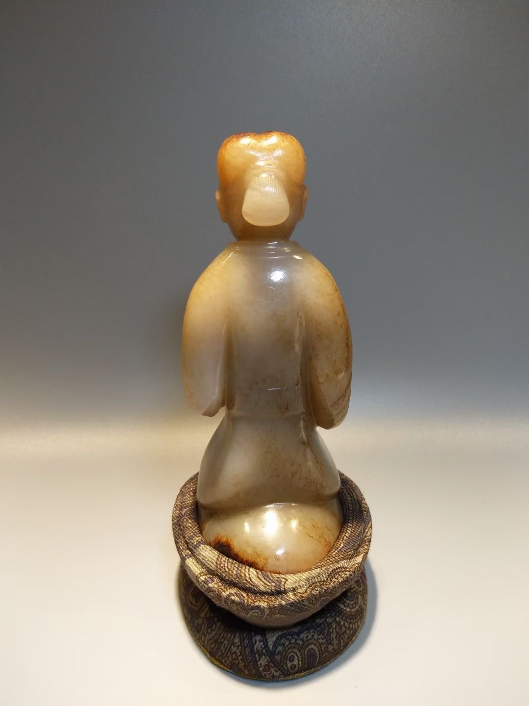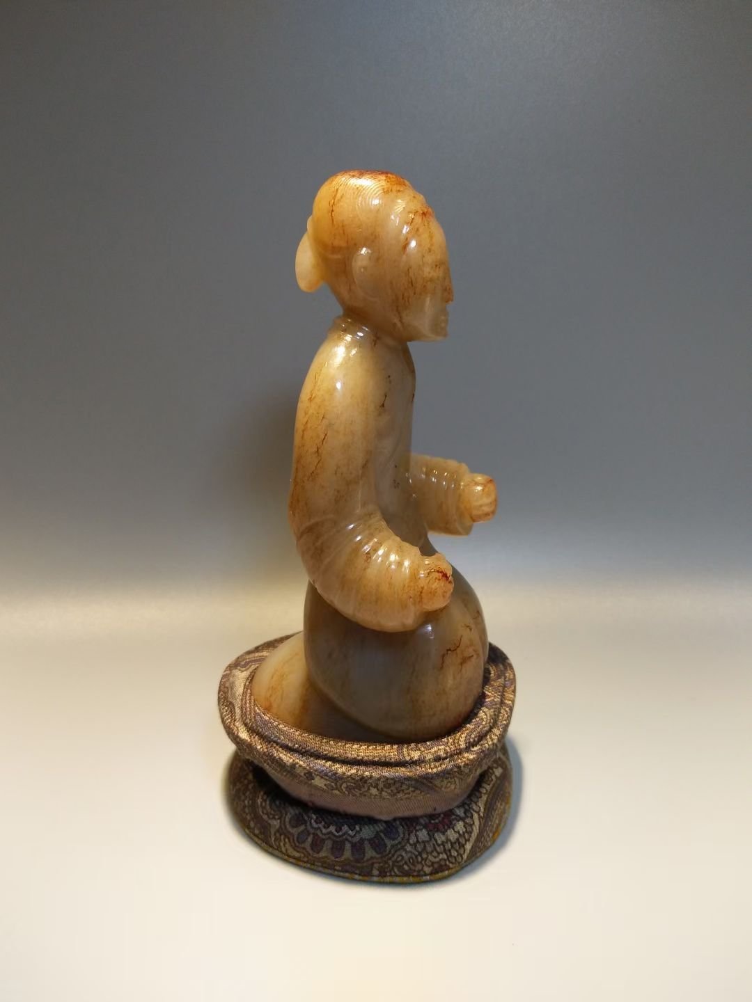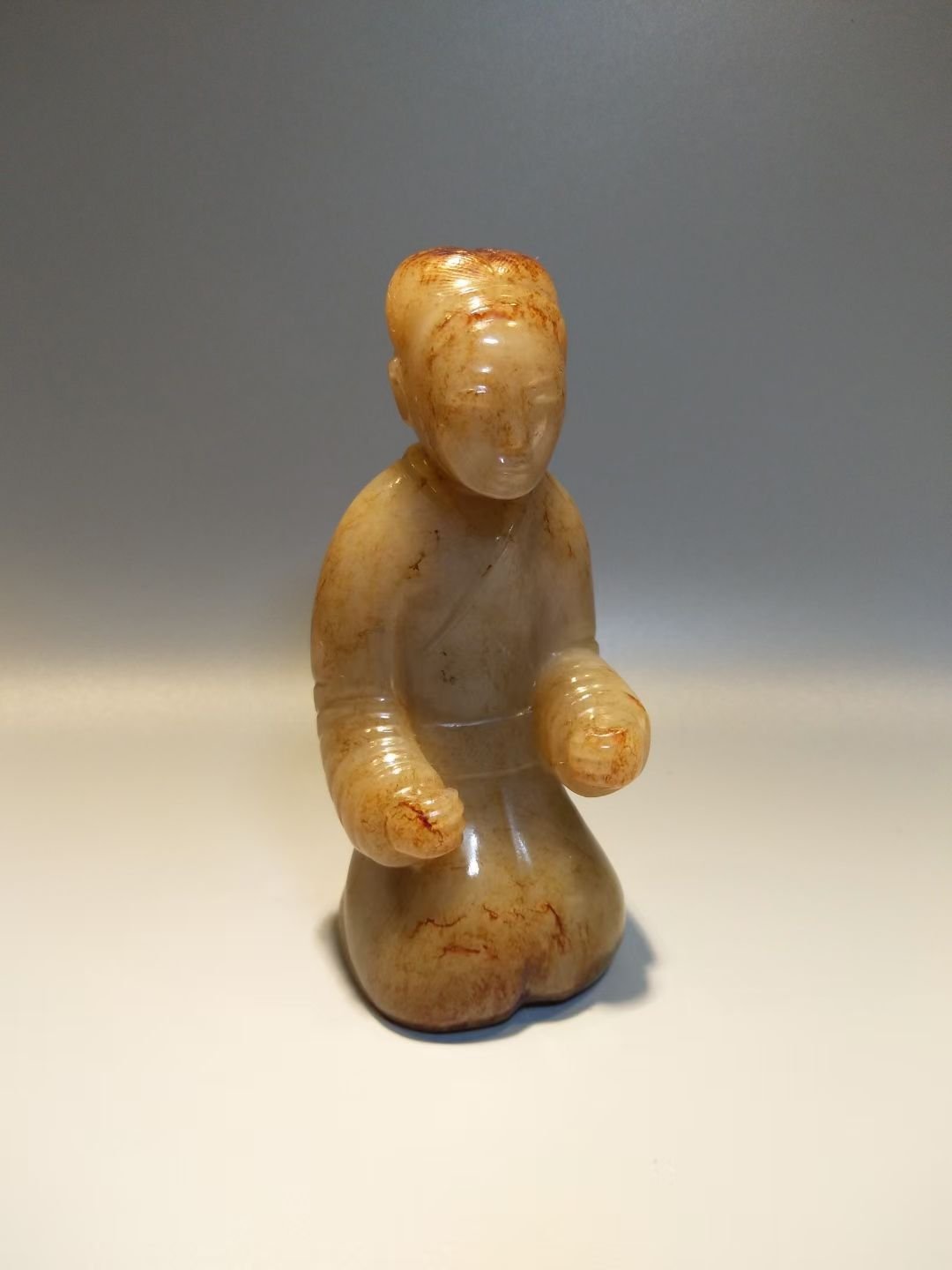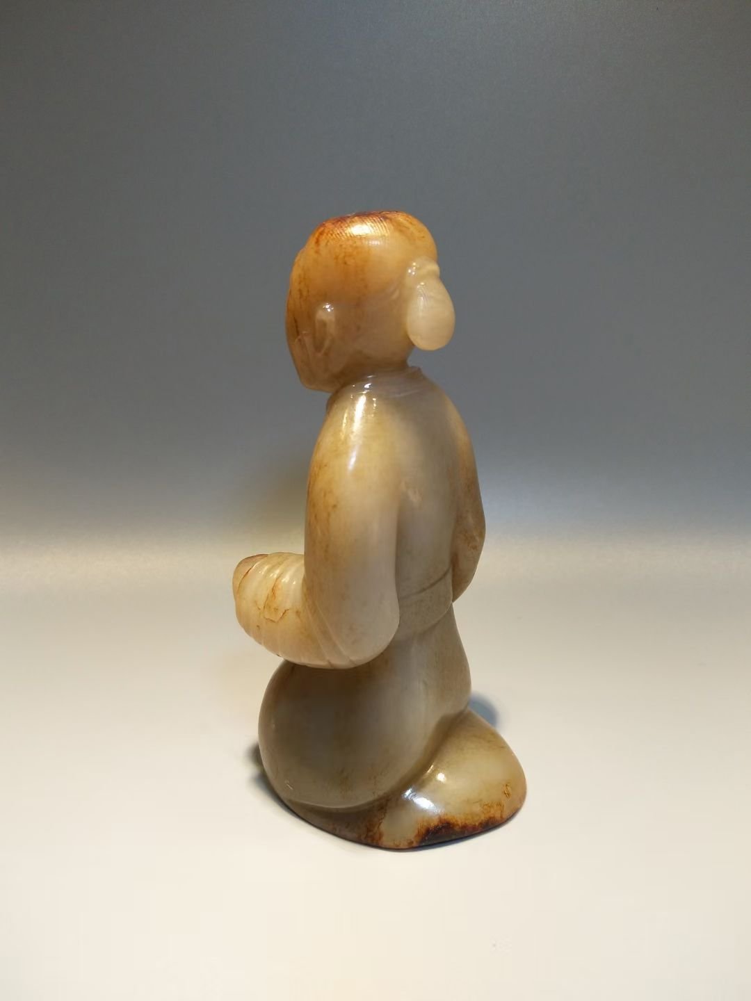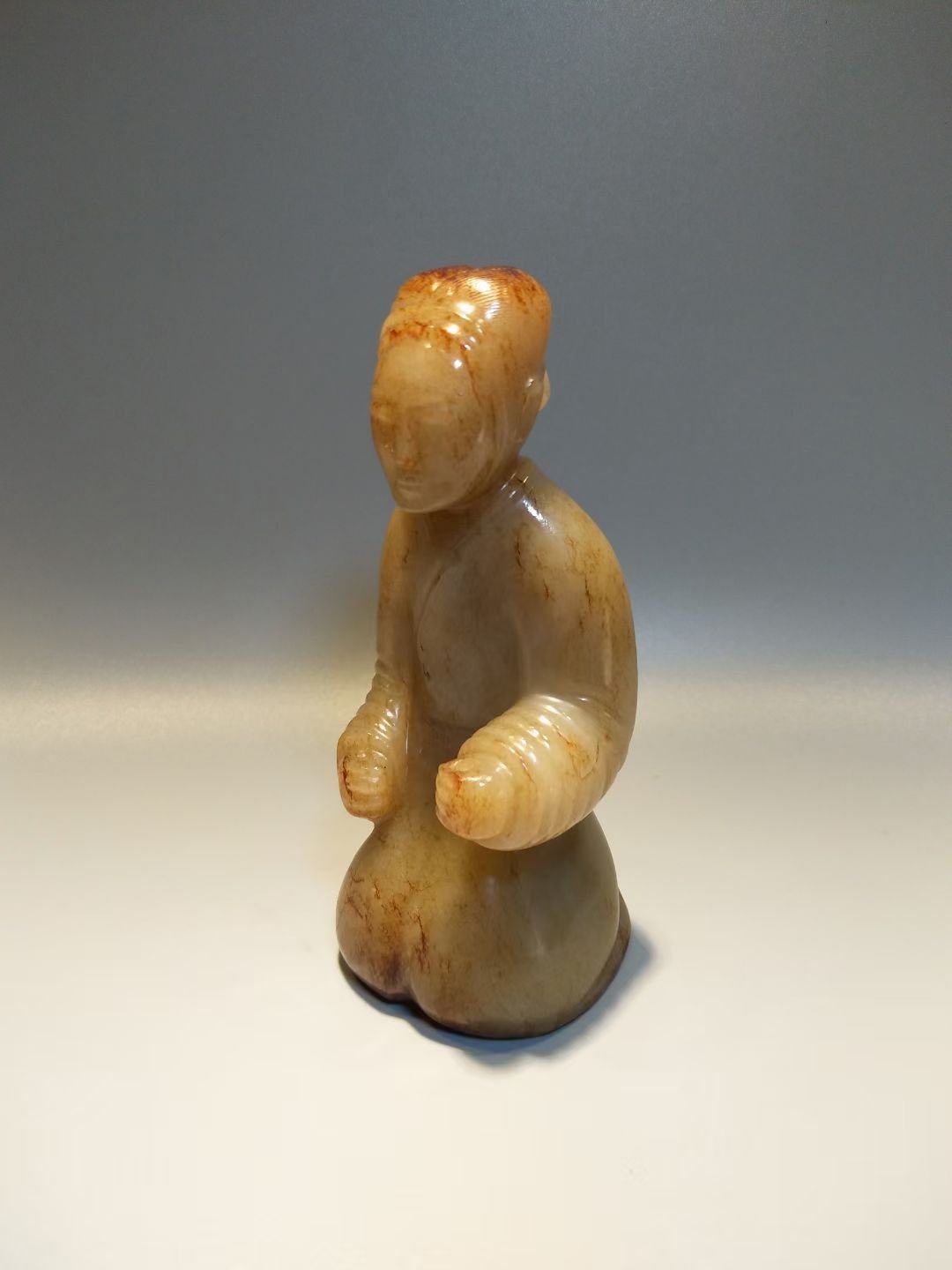 高古玉 汉代老妪圆雕作品,跪坐相,新疆和田白玉质,沁色年久,已成秋葵色,包浆滋润