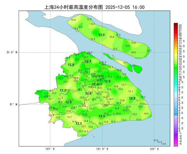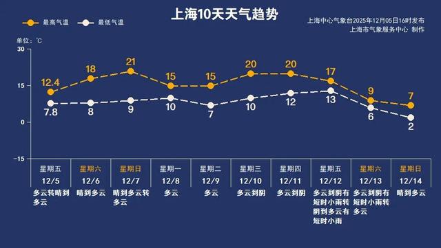 白天上海多云为主,云层遮挡下,气温回升较为缓慢,全市最高气温在12~14℃,其中徐家汇站12.4℃,体感还是有些冷。