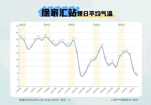 11月以来,每逢双休日徐家汇站的日平均气温和工作日相比呈现相对偏高的态势。尤其在11月中旬后,气温“大起大落”,双休日的“暖”也更为突出,本周双休日也符合这一“魔性”规律。