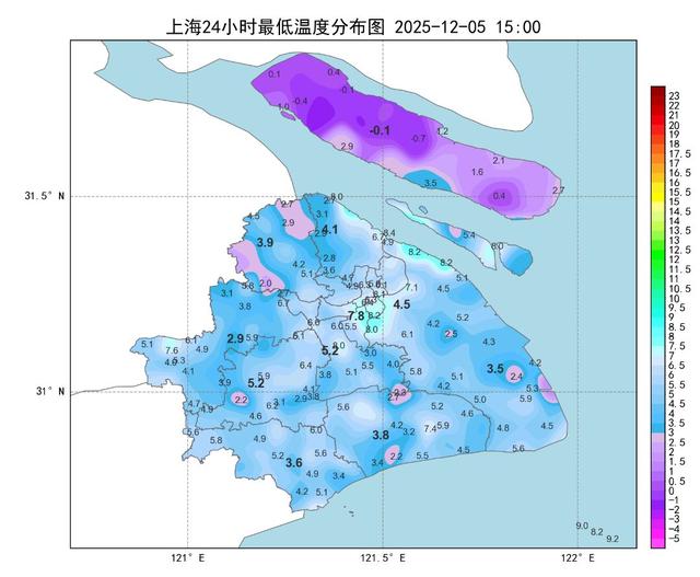 受辐射降温影响,今天早晨上海崇明站最低气温零下0.1℃为全市最低,其余各区多在3~8℃之间,较昨天有所回升。