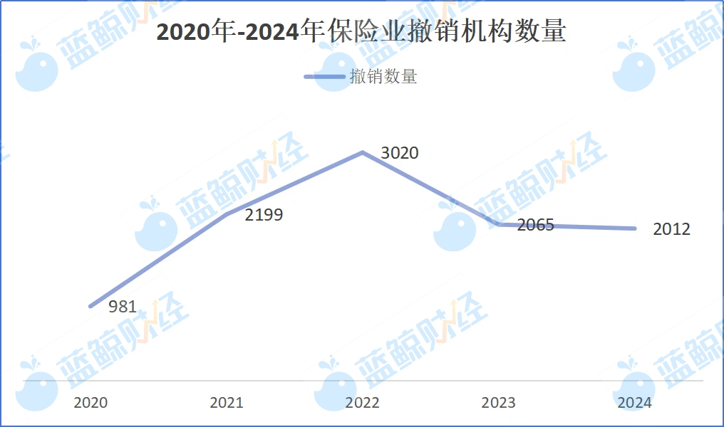 一场席卷行业的分支机构“瘦身潮”已然兴起。蓝鲸新闻根据金融监管总局披露信息梳理,2020年至2024年这5年间,保险业累计撤销分支机构超万家,其中前三年撤销节奏逐步加快,2022年达到高峰,一年内超3000家机构退出舞台,2023年后则逐步回落。