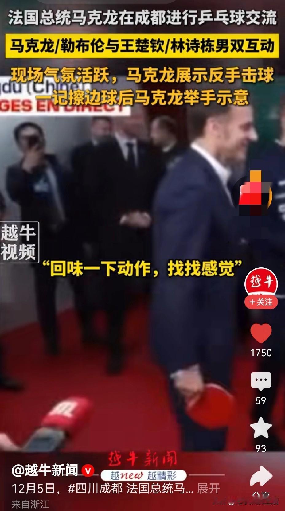 马克龙来中国是在下一盘大棋! 在成都室外公园去晨跑,又和王楚钦打乒乓球,搞的好像不是来出差访问的,怎么看怎么像是出来旅游度假,或者回到自己家了一样。 能做到他这么随性,并且与民间互动的总统,估计也就只有普京了吧。 当年普京来中国也是去了很多地方,还特别跑到河南嵩山少林寺交流少林武术。 好像接待他的方丈就是不久前被抓起来的释永信吧,特工出身的普京,一直都对中国武术感兴趣,更是对中国人民的热情友好比较信任,所以才敢到处在中国逛逛、看看。 这次马克龙在开放性公园里,和普通市民一起晨跑,并且没有进行清场等行为,估计他也是想向全世界证明,中国是世界上最安全的国家,没有之一吧。 他这次和我们一起发表不少的联合声明,除了相互合作以外,还有对国际形势交换意见。 也难怪G20的时候,马克龙一脸嫌弃的看着毒苗,并且多次刻意回避不和那人握手或者其他肢体接触。 原来他是要以身入局,旨在带动两国的更多合作和交流,他也是向法国人再一次证明和中国做朋友是没有错的,中国不但热情最主要还是非常安全!