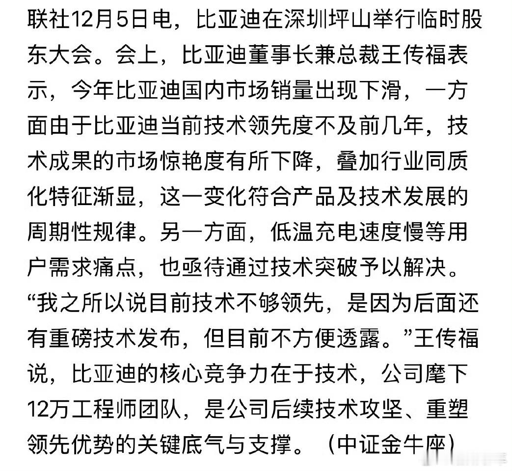 12月5日,比亚迪在深圳坪山举行临时股东大会。比亚迪董事长兼总裁王传福表示