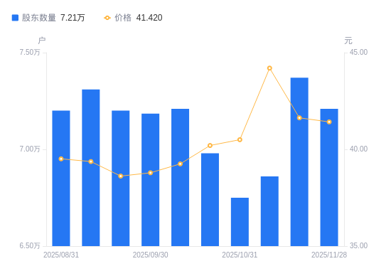 日期A股户数(户)流通A股户均持股数(股)户均持股市值(万元)2025-11-28721006439.8426.672025-11-20737006299.9626.232025-11-10686006768.3229.922025-10-31675006878.6227.862025-10-20698006651.9626.742025-10-10721006439.4925.282025-09-30718486462.0825.072025-09-19720006582.8025.422025-09-10731006483.7525.532025-08-31720006581.2226.00