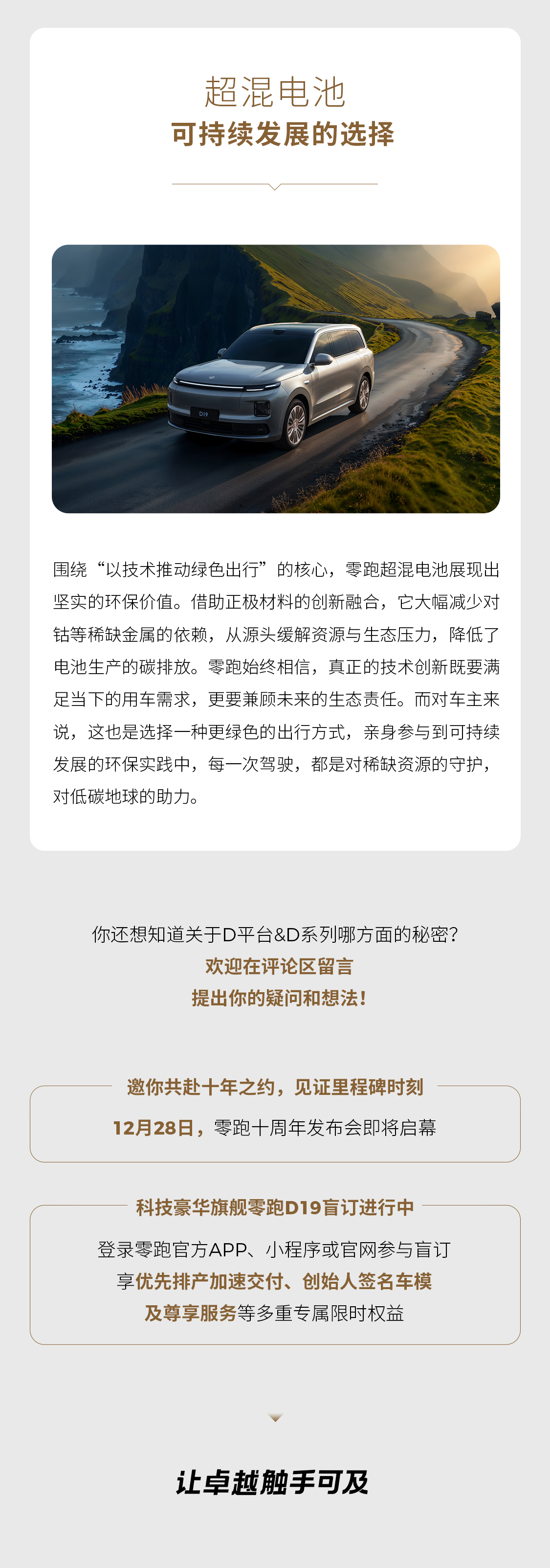 续航焦虑?电池不耐用?想要跑得远更要安全?零跑旗舰D平台 超混电池给出新答案《D100个秘密》专栏第四期:深度解密零跑混合体系电池的硬核创新看它如何解答“电池续航与安全兼顾”的课题零跑D19零跑汽车
