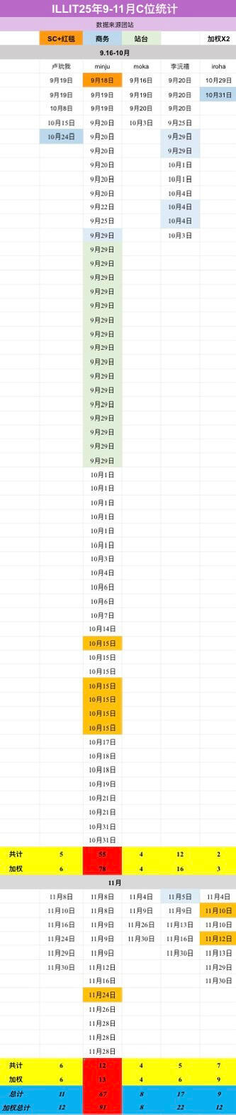 illit 9-11月C位统计拉表卢玧我YUNAH、李沅禧WONHEE、朴敏珠