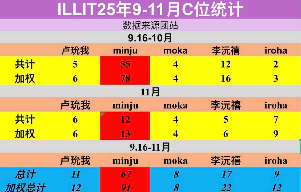 illit 9-11月C位统计拉表卢玧我YUNAH、李沅禧WONHEE、朴敏珠 MINJU、境萌花 MOKA、外园彩羽 IROHA