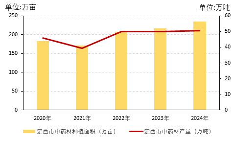 图1定西中药材种植面积以及产量统计