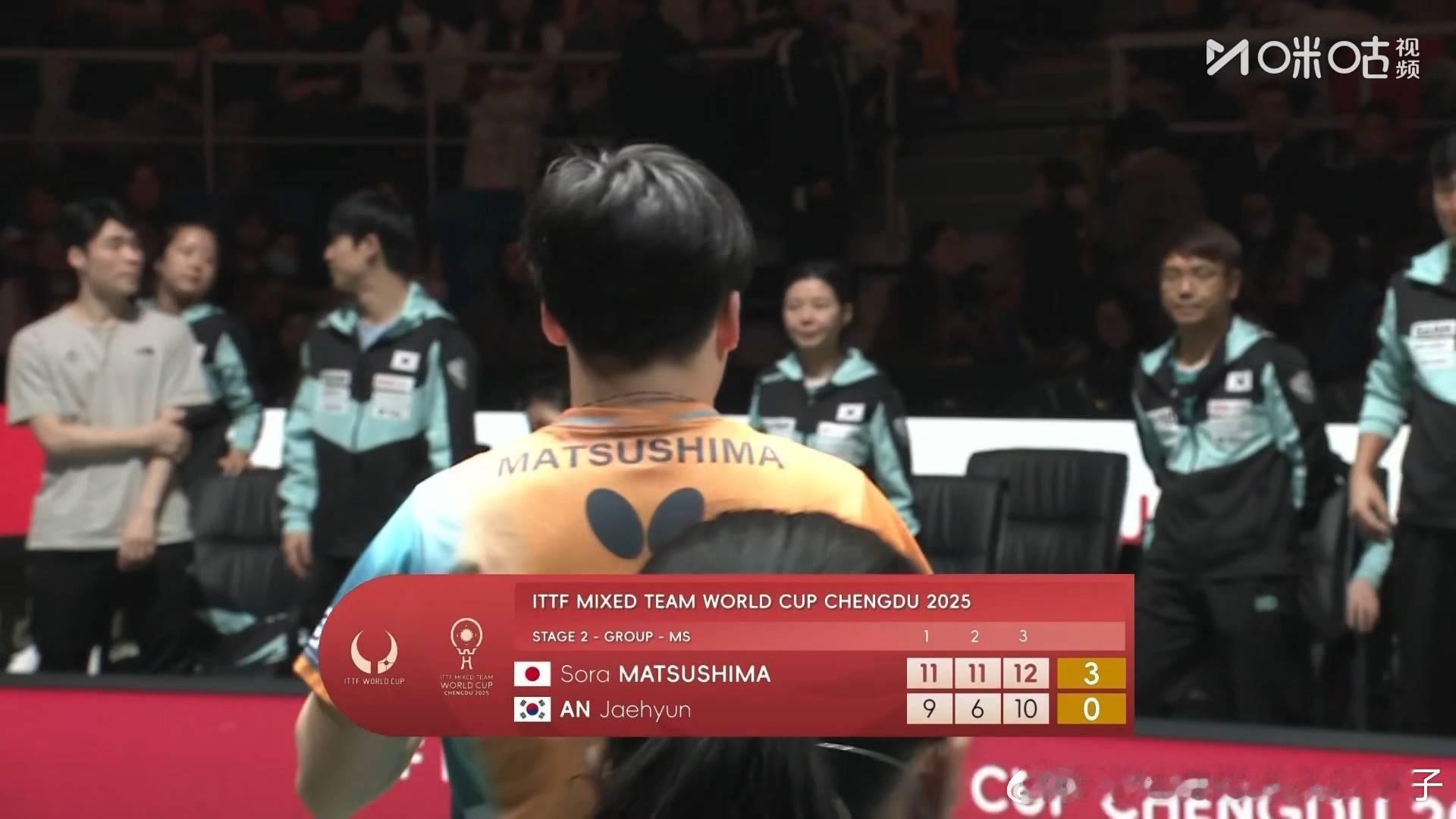 松岛辉空3比0安宰贤(9,6,10)第四盘:筱塚大登户上隼辅VS吴晙成安宰贤日本队七比二韩国队2025年国际乒联成都混合团体世界杯第二阶段