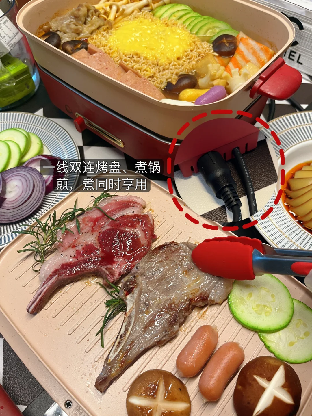 我最喜欢的一点是它的一线双连设计,能做到一边煮火锅一边烤肉,享受着浓郁的部队火锅同时还能再烤个羊排,鸡翅,真的是双重享受~