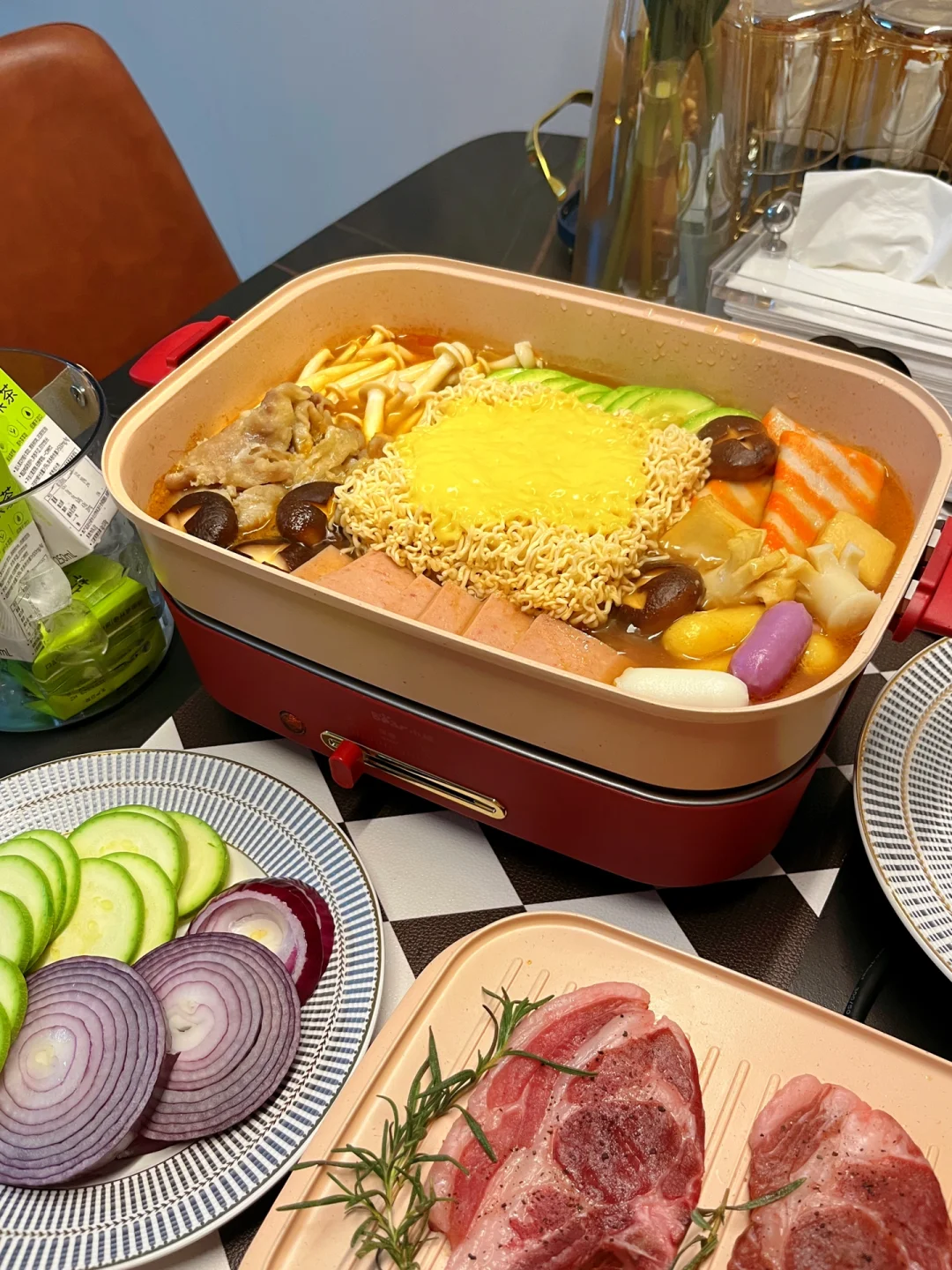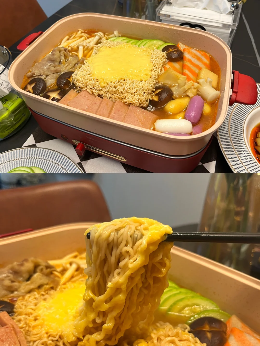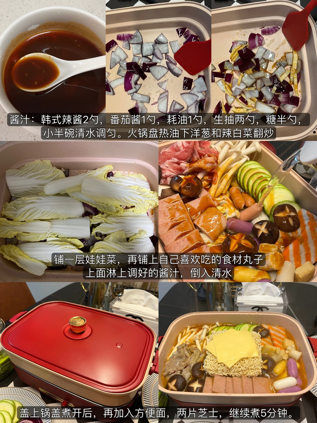 【部队火锅】:牛肉卷,芝士年糕,午餐肉,蟹排,开花肠,亲亲肠,鱼豆腐,蟹味菇,香菇,西葫芦,娃娃菜,方便面,芝士。