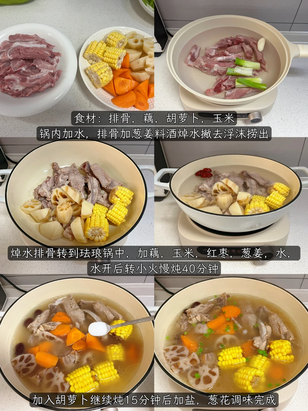 1️⃣食材:排骨、莲藕、玉米、胡萝卜、葱姜大枣。2️⃣锅内加水,排骨加葱姜料酒焯水撇去浮沫捞出。3️⃣焯水排骨转到珐琅锅中,加藕,玉米,红枣,葱姜,水开后转小火慢炖40分钟4️⃣加入胡萝卜继续炖15分钟后加盐,葱花调味完成。