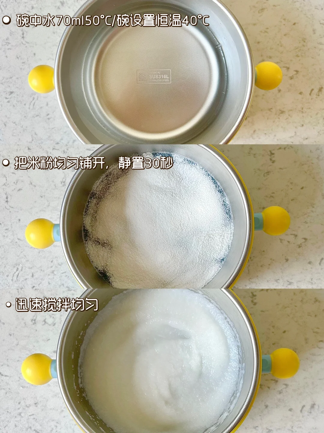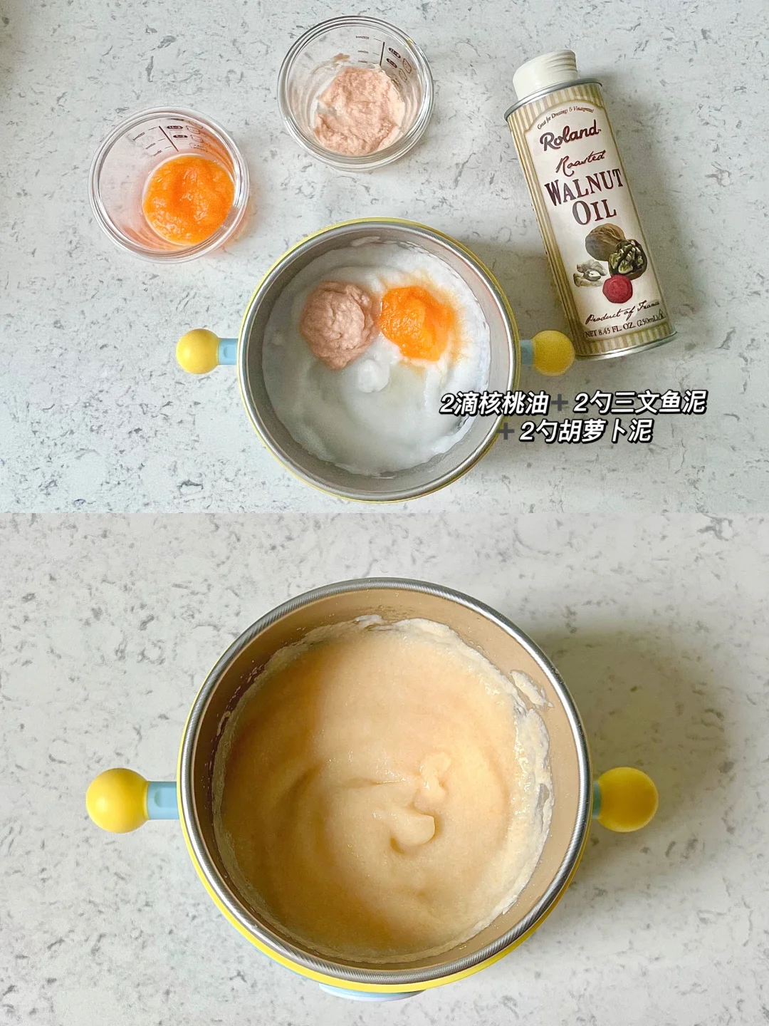 📝:7.5米粉➕70ml水,2滴核桃油➕2勺三文鱼泥➕2勺胡萝卜泥