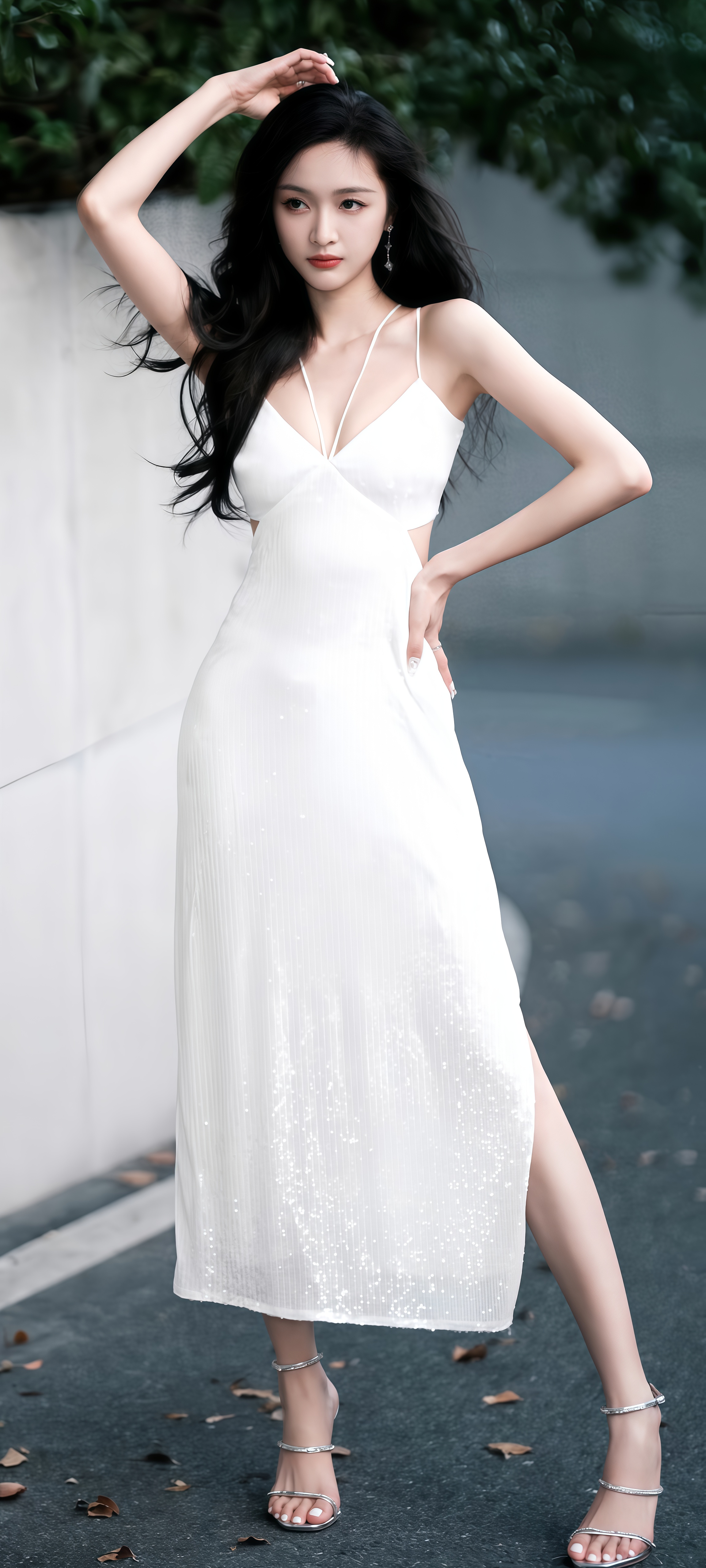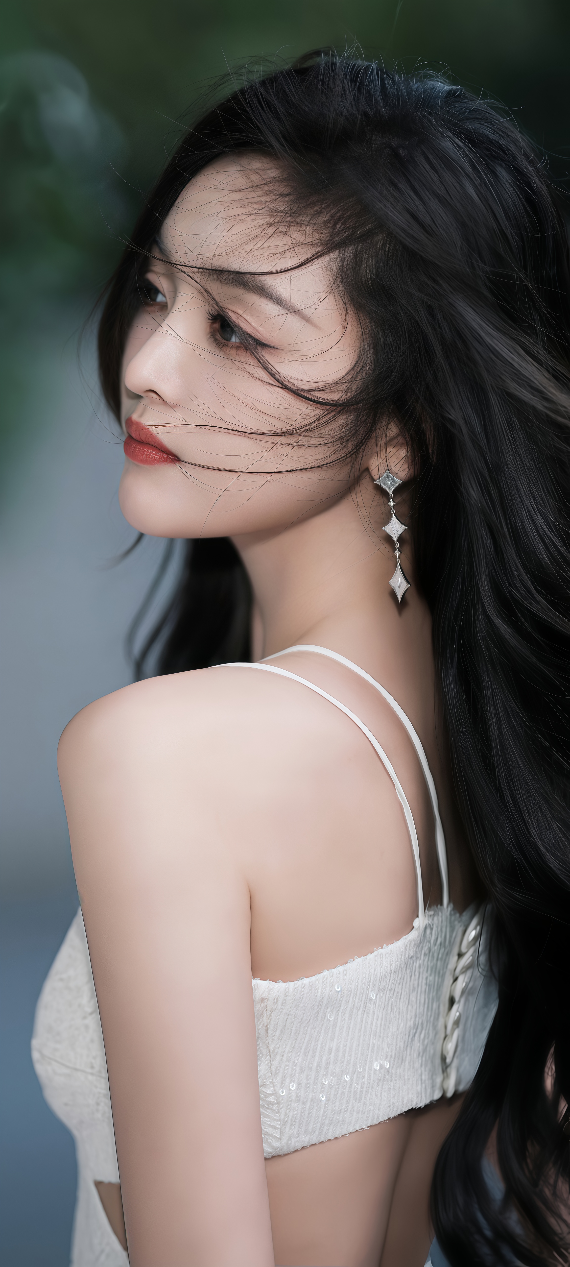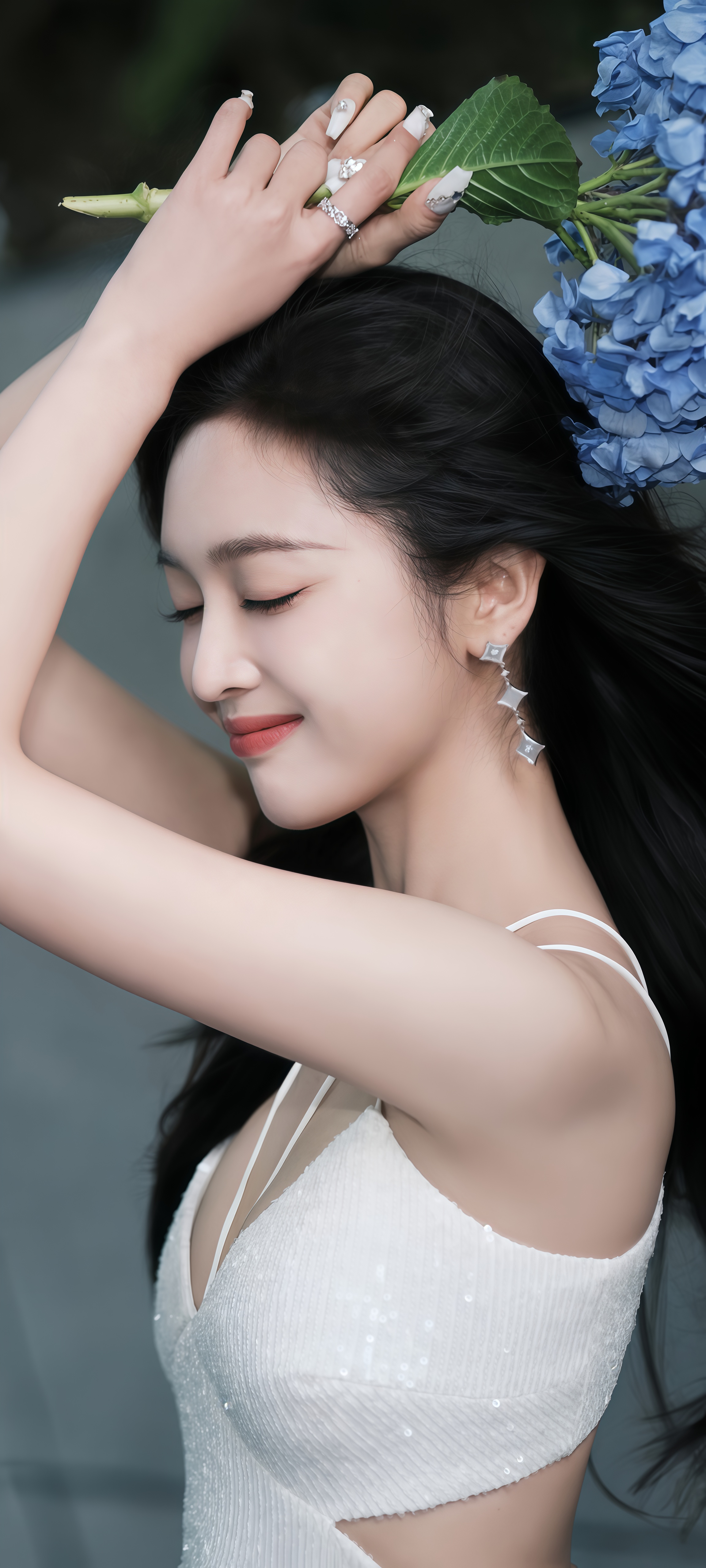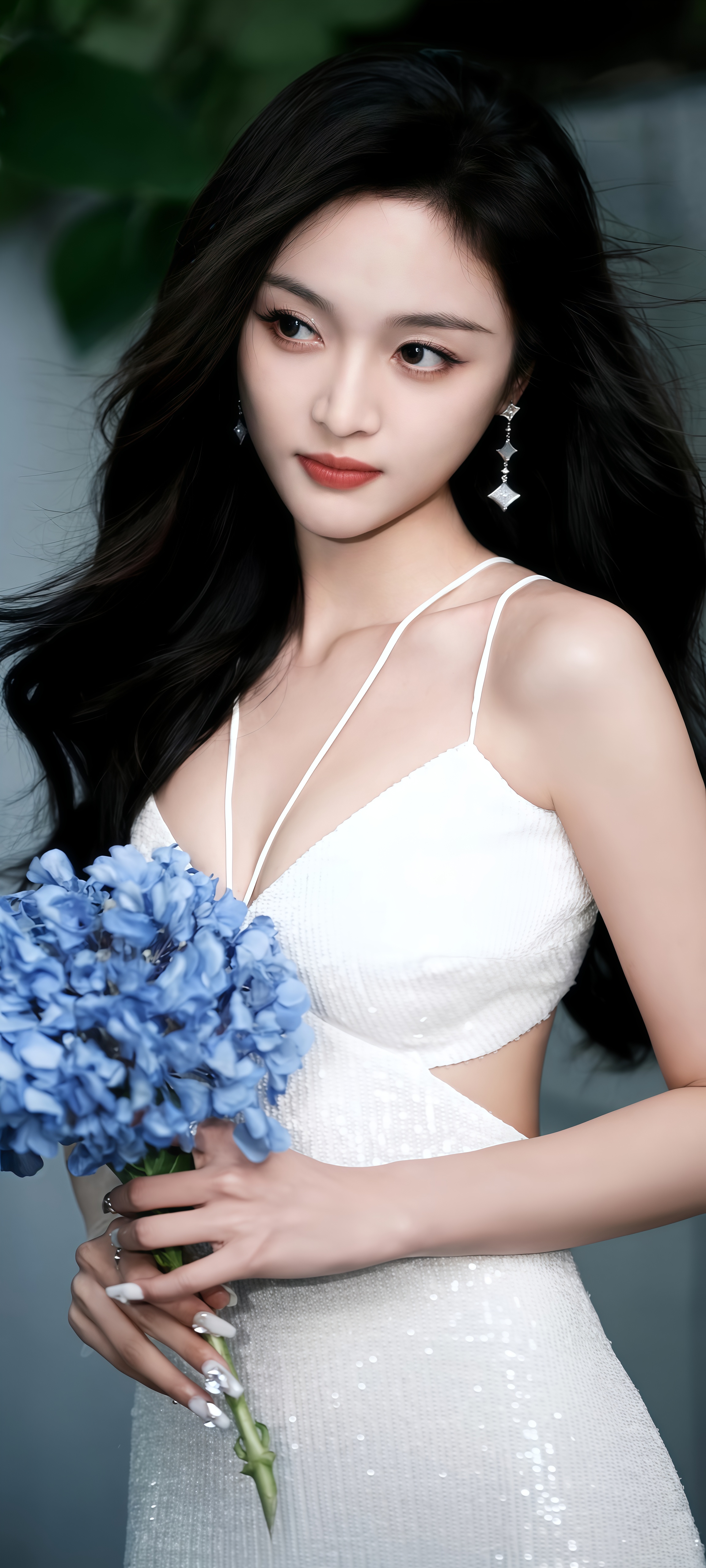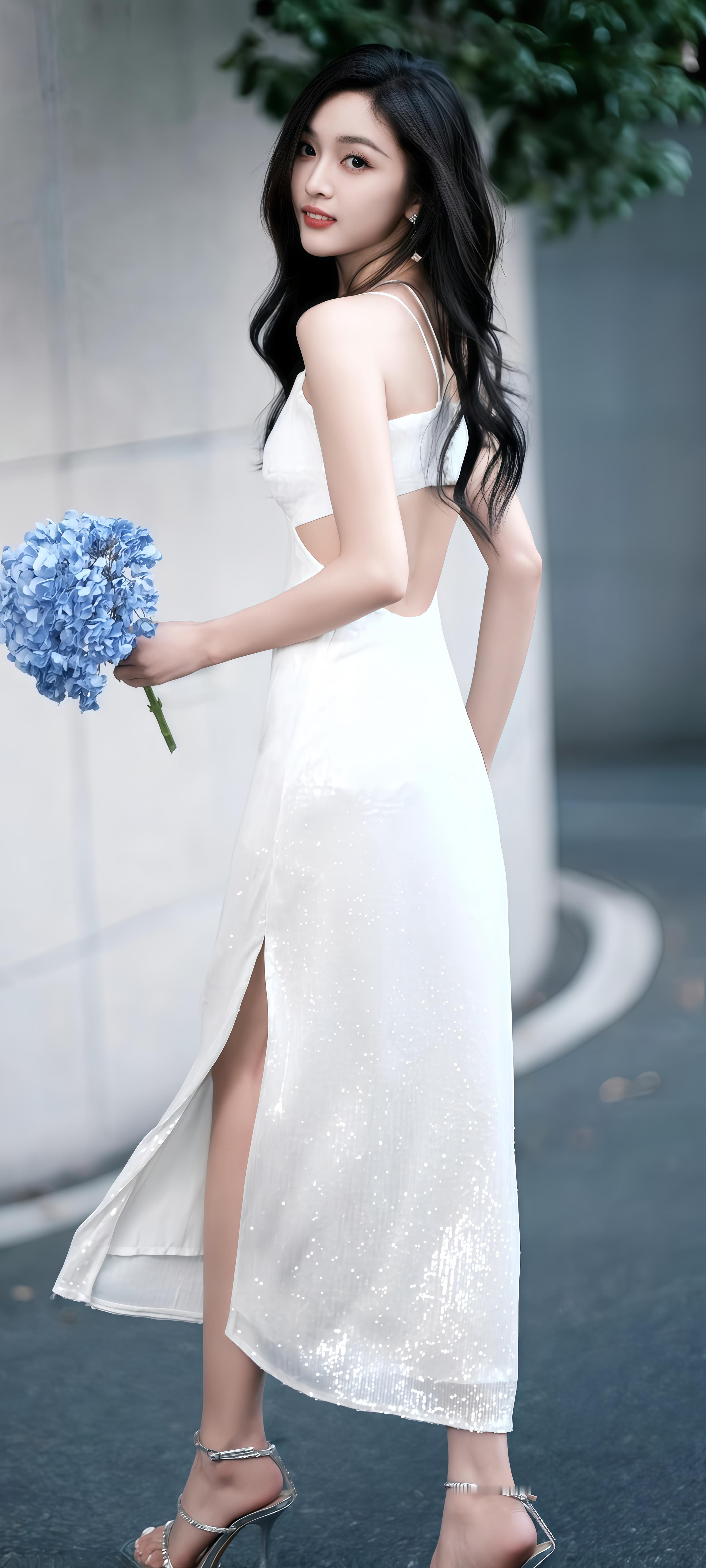 吊带露背设计精准戳中审美点,碎钻裙摆随微风轻晃,blingbling闪到心尖,手里的蓝绣球自带温柔滤镜,连被风吹乱的发丝都透着恰到好处的慵懒,把“清冷破碎感”焊得死死的✨