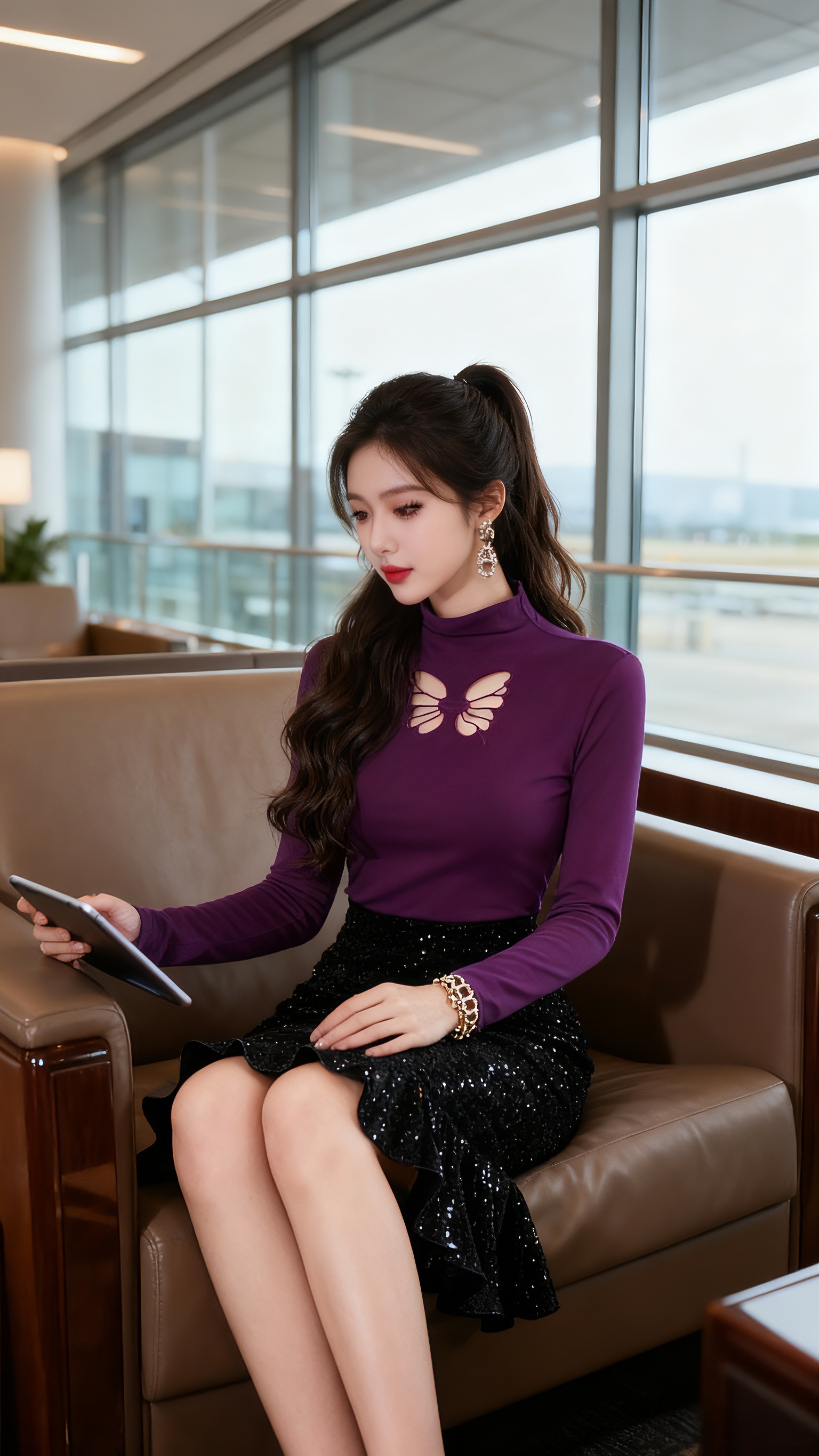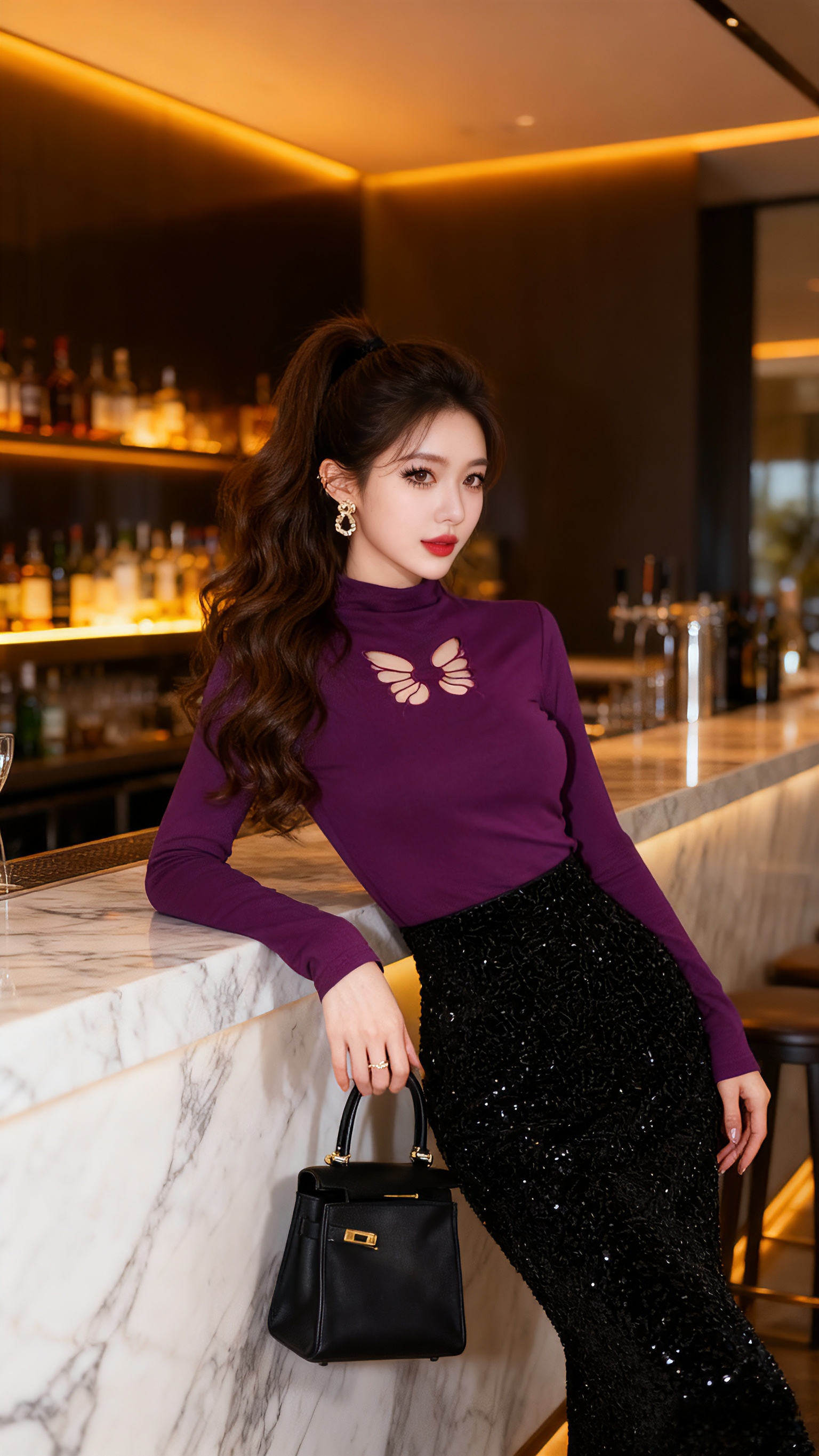 不是因为那条闪得晃眼的鱼尾裙,是她内搭的深紫打底衫——磨毛面料裹出腰窝的弧度,蝴蝶镂空刚好露在锁骨下两寸,像暗夜里振翅的蝶。