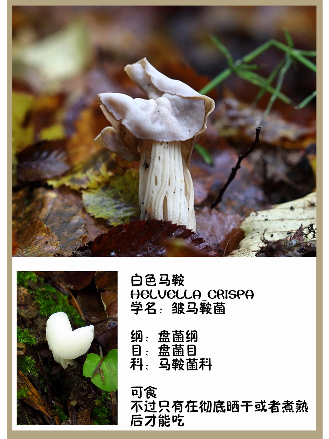 白色马鞍 helvella_crispa 学名:皱马鞍菌 纲:盘菌纲 目:盘菌目 科:马鞍菌科 图片©manatarka.org ©josef hlasek 可食[害羞R] 不过只有在彻底晒干或者煮熟后才能吃[doge]