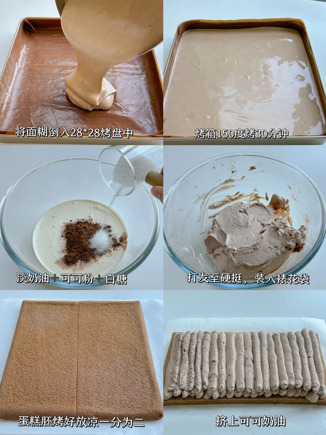 3️⃣淡奶油+可可粉+白糖打发至硬挺装入裱花袋;烤好的蛋糕胚放凉一分为二,其中一片蛋糕胚上挤上可可奶油抹平,再盖上另一片蛋糕片,冷藏定型30分钟左右。