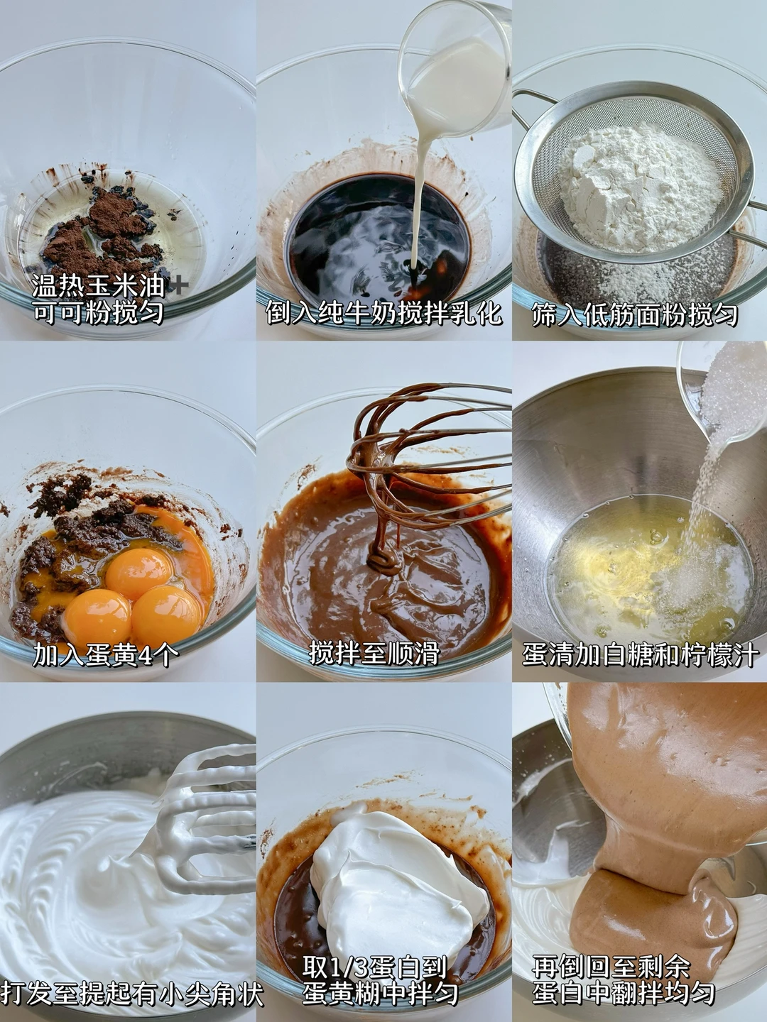 1️⃣温热玉米油+可可粉搅匀,倒入纯牛奶搅拌至乳化,筛入低筋面粉搅拌至无干粉,加入蛋黄4个搅拌至顺滑。