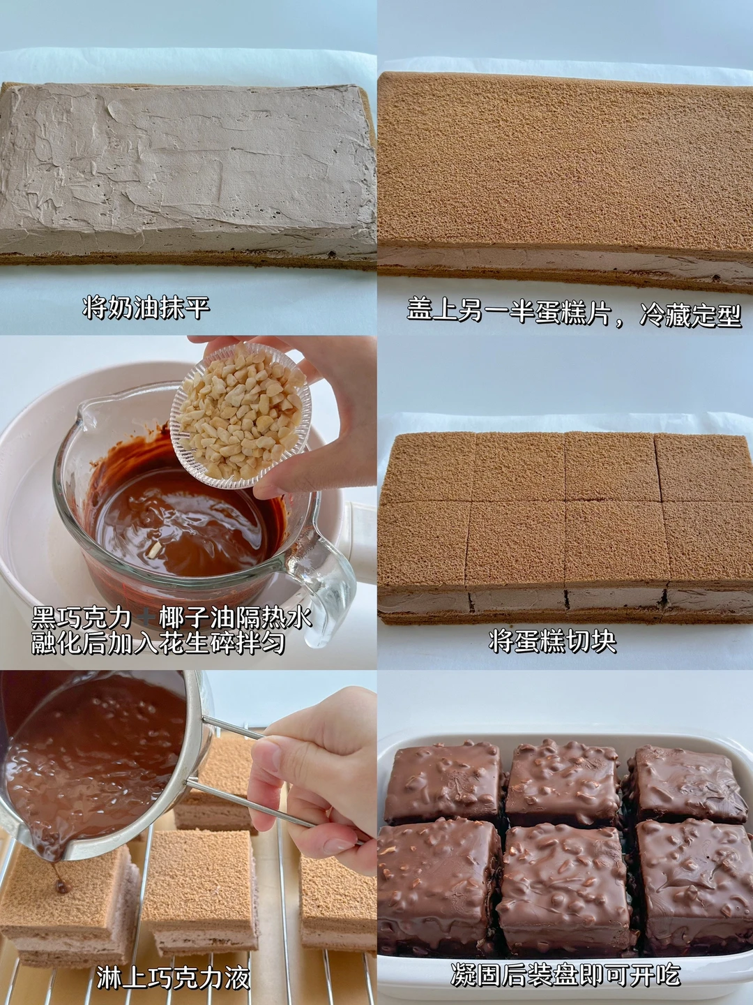 4️⃣黑巧克力+椰子油隔热水融化后加入花生碎拌匀备用;将冷藏定型的蛋糕切小块,淋上巧克力液,凝固后装盘即可开吃。