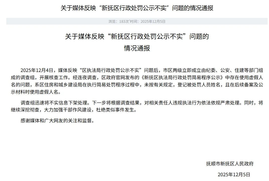 通报称,2025年12月4日,媒体反映“区执法局行政处罚公示不实”问题后,市区两级立即成立由纪委、公安、住建等部门组成的调查组,开展核查工作。经连夜调查,区政府官网发布的《新抚区执法局行政处罚简易程序公示》中存在使用虚假人名的问题,系区住房和城乡建设局在执行简易处罚程序过程中,未按有关规定,登记被处罚人员姓名,且在后续备案及公示材料时使用虚假人名。