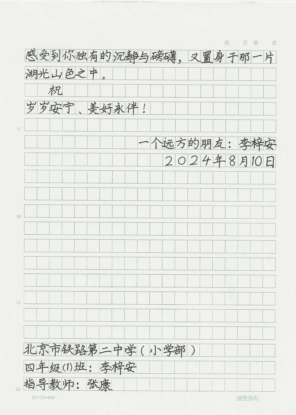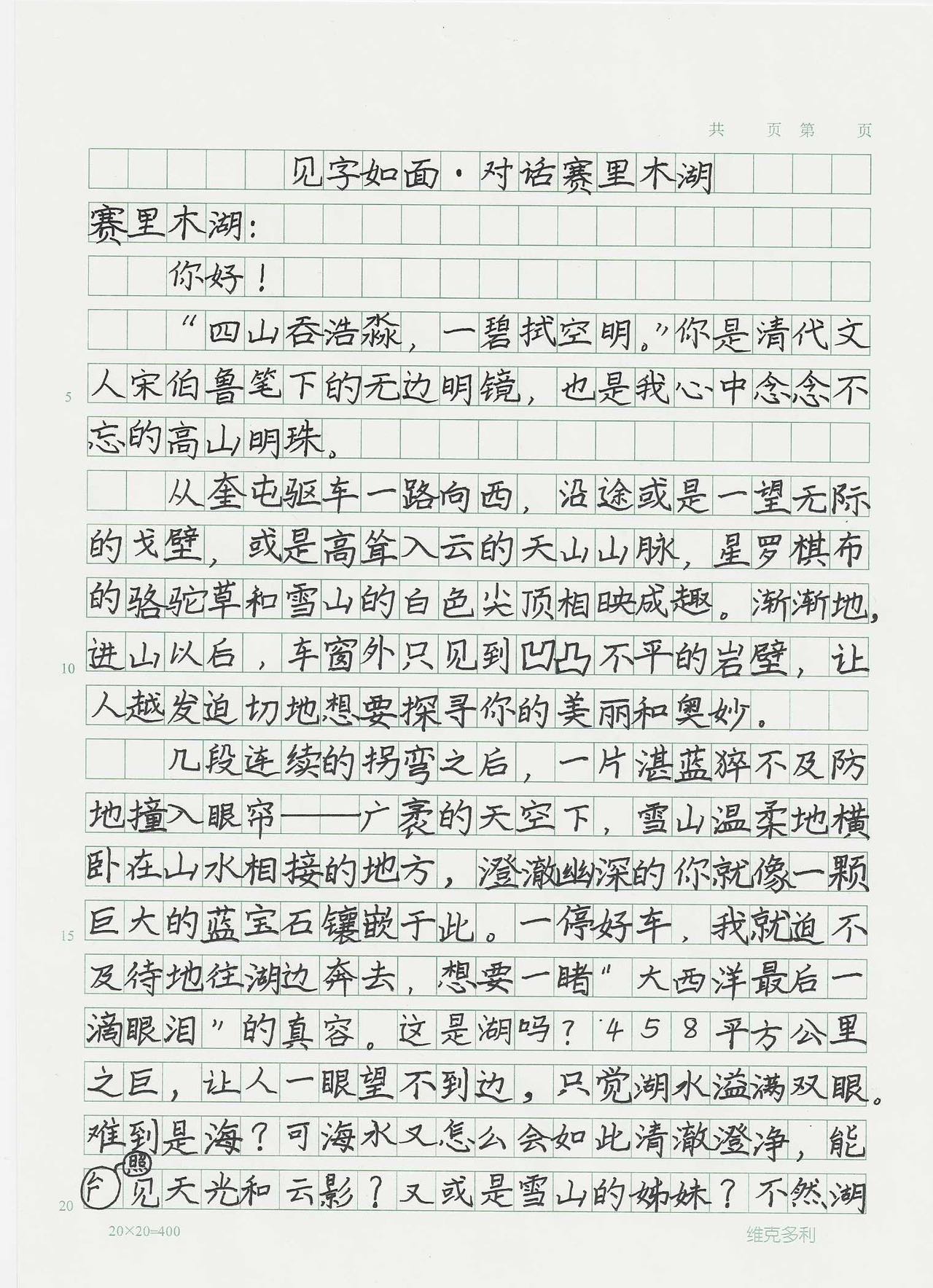 今天这幅AI绘画作品的原型来自北京市铁路第二中学小学部四年级(1)班李梓安的书信作品《见字如面·对话赛里木湖》。