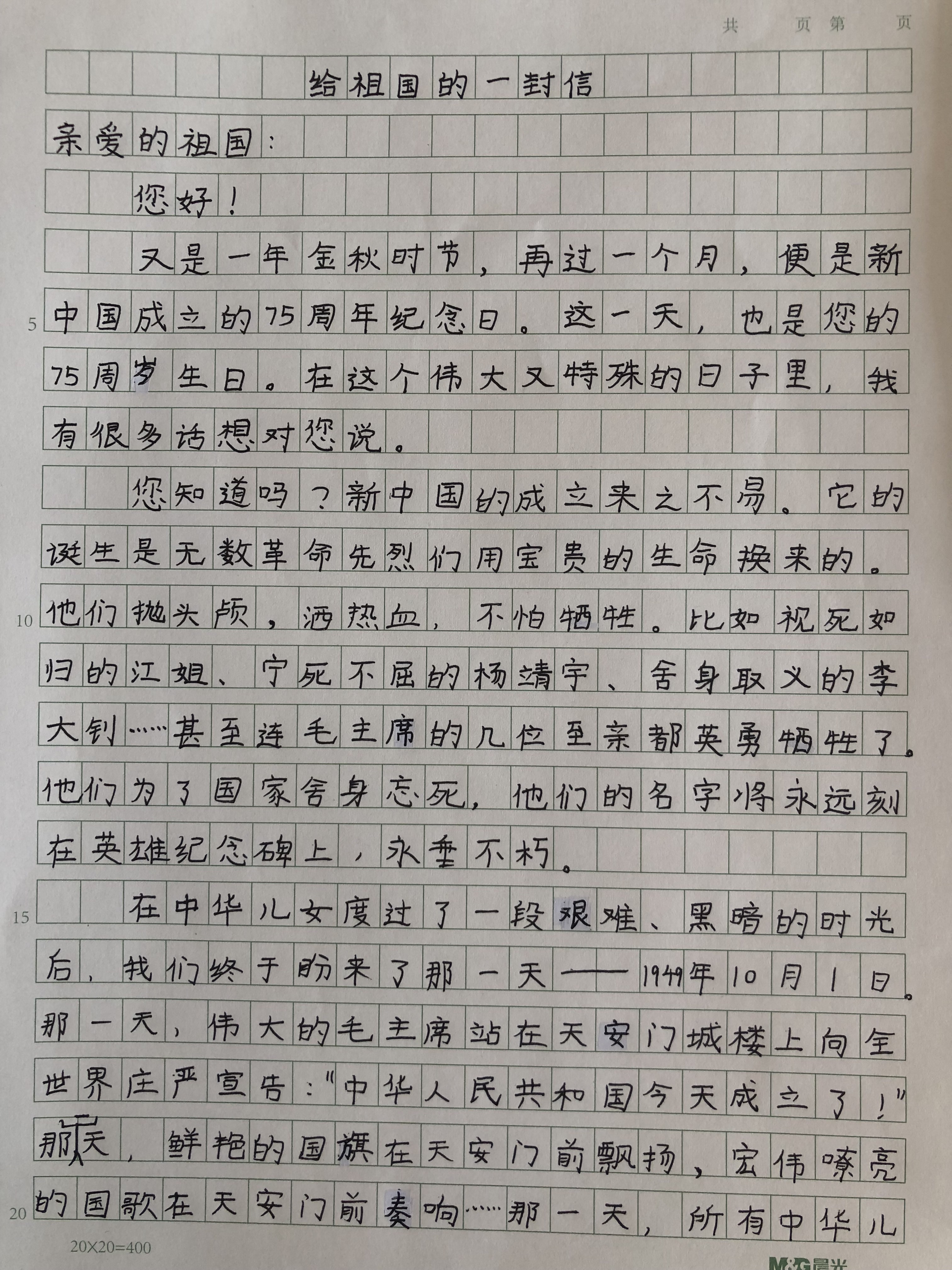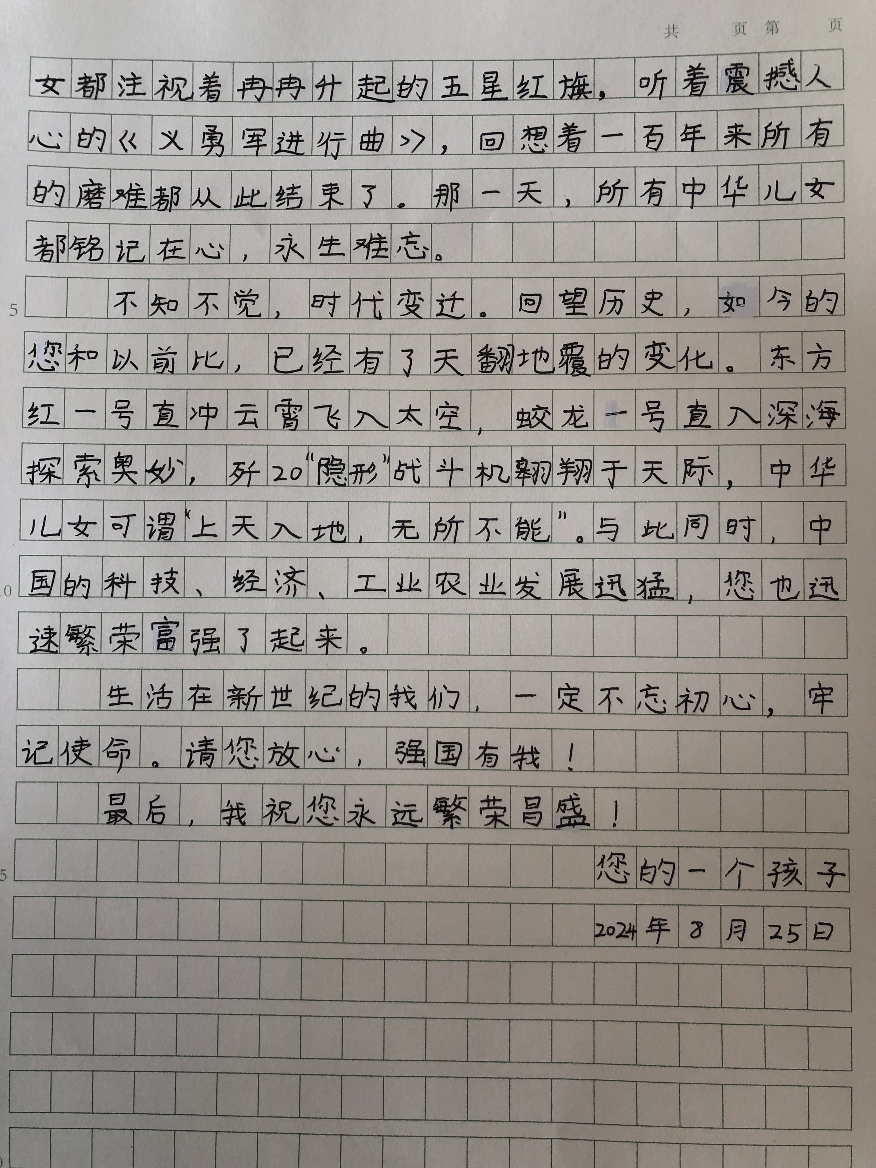 今天这幅AI绘画作品的原型来自丰台区第一小学角门分校六年级(1)班张佳霖的书信作品《给祖国的一封信》。