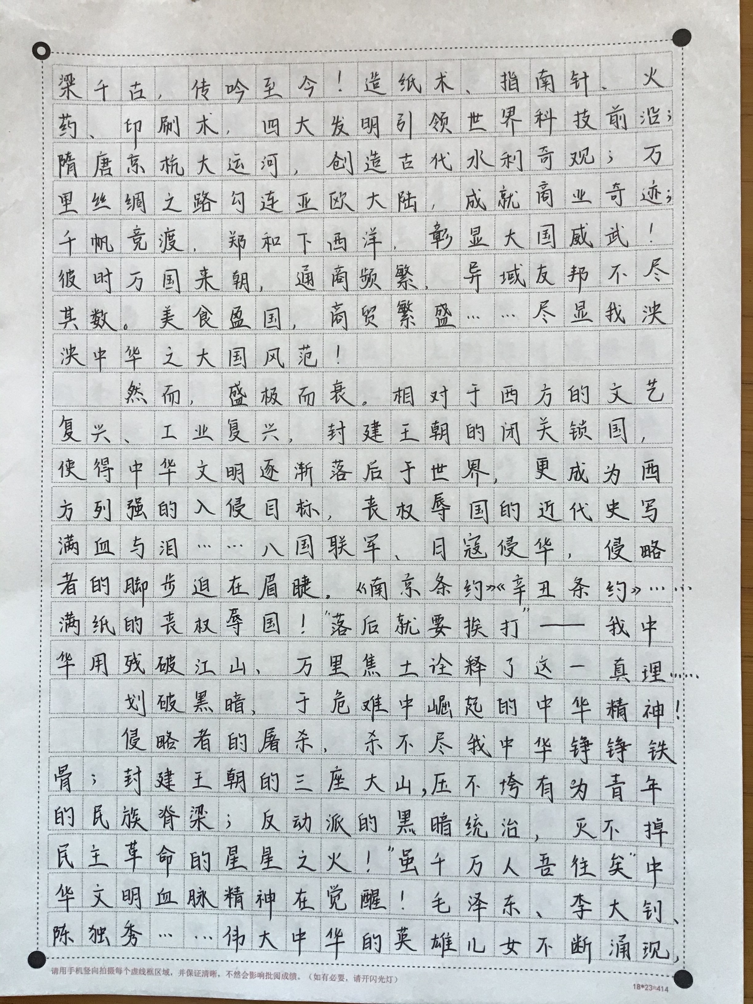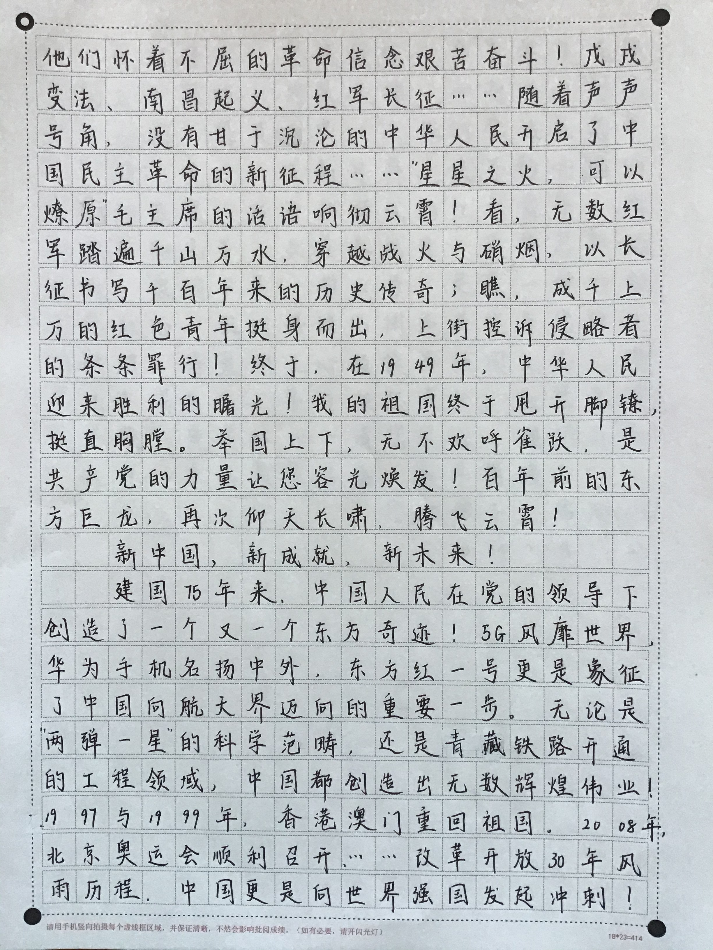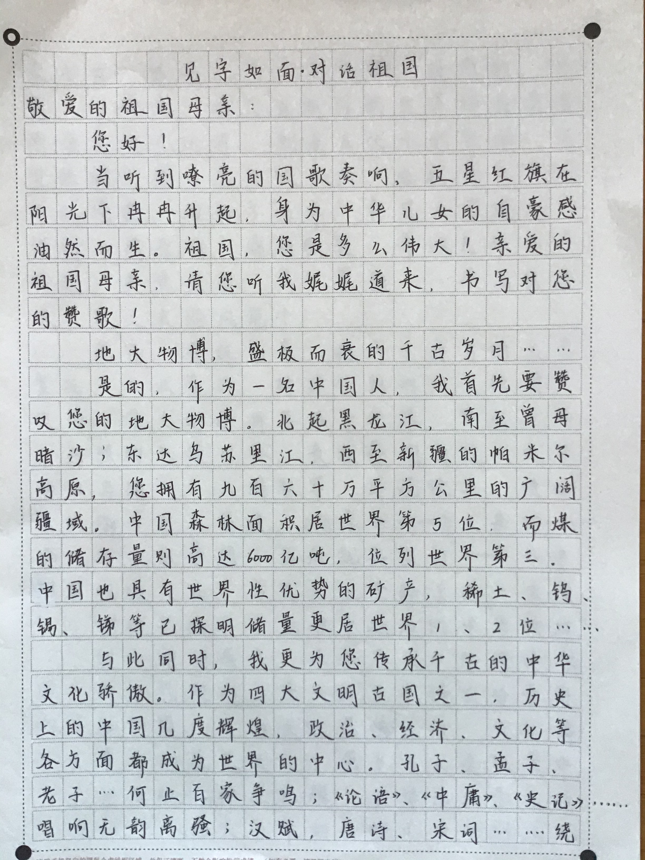 今天这幅AI绘画作品的原型来自北京市第三中学八年级(4)班常越涵的书信作品《见字如面・对话祖国》。