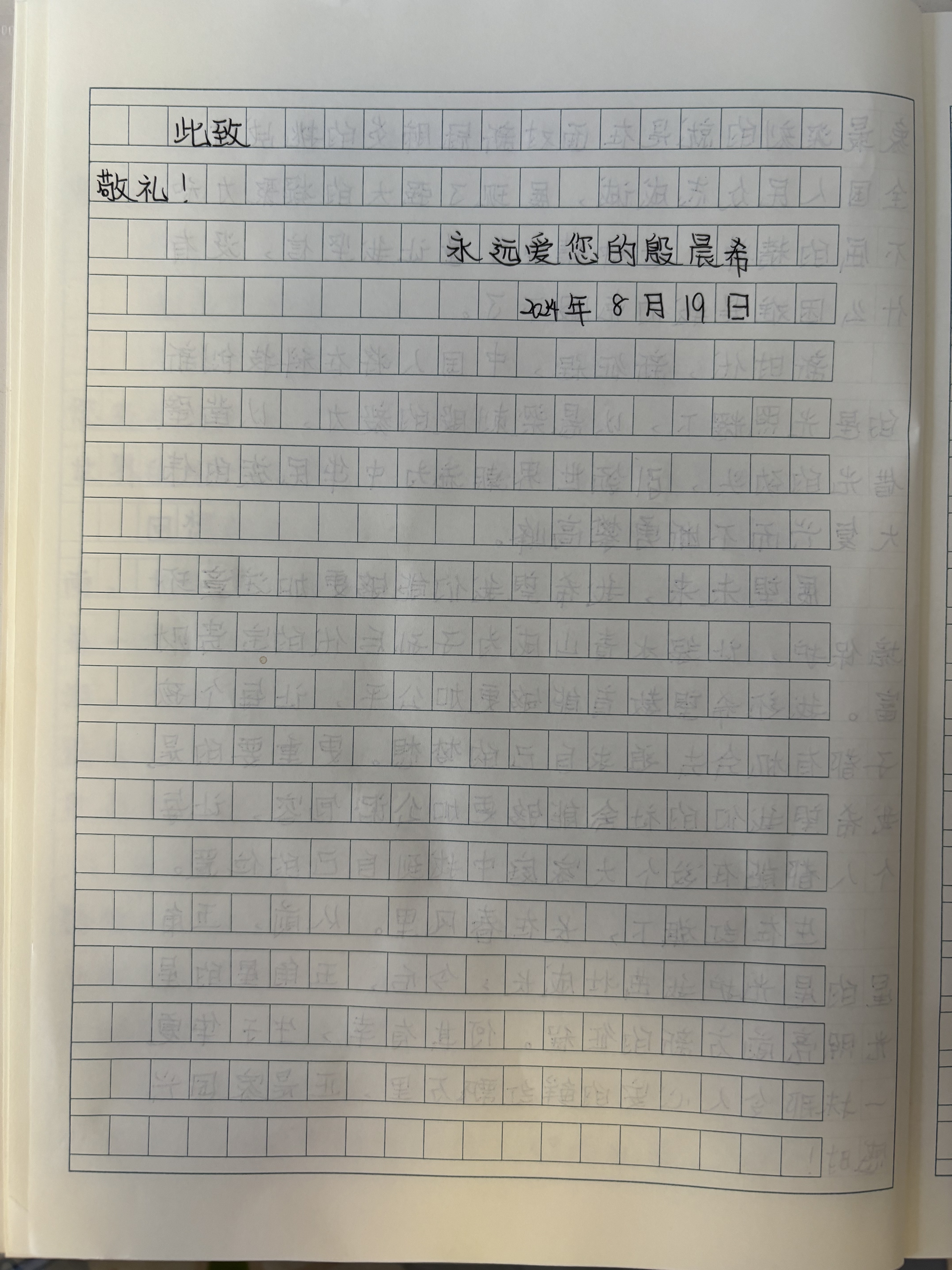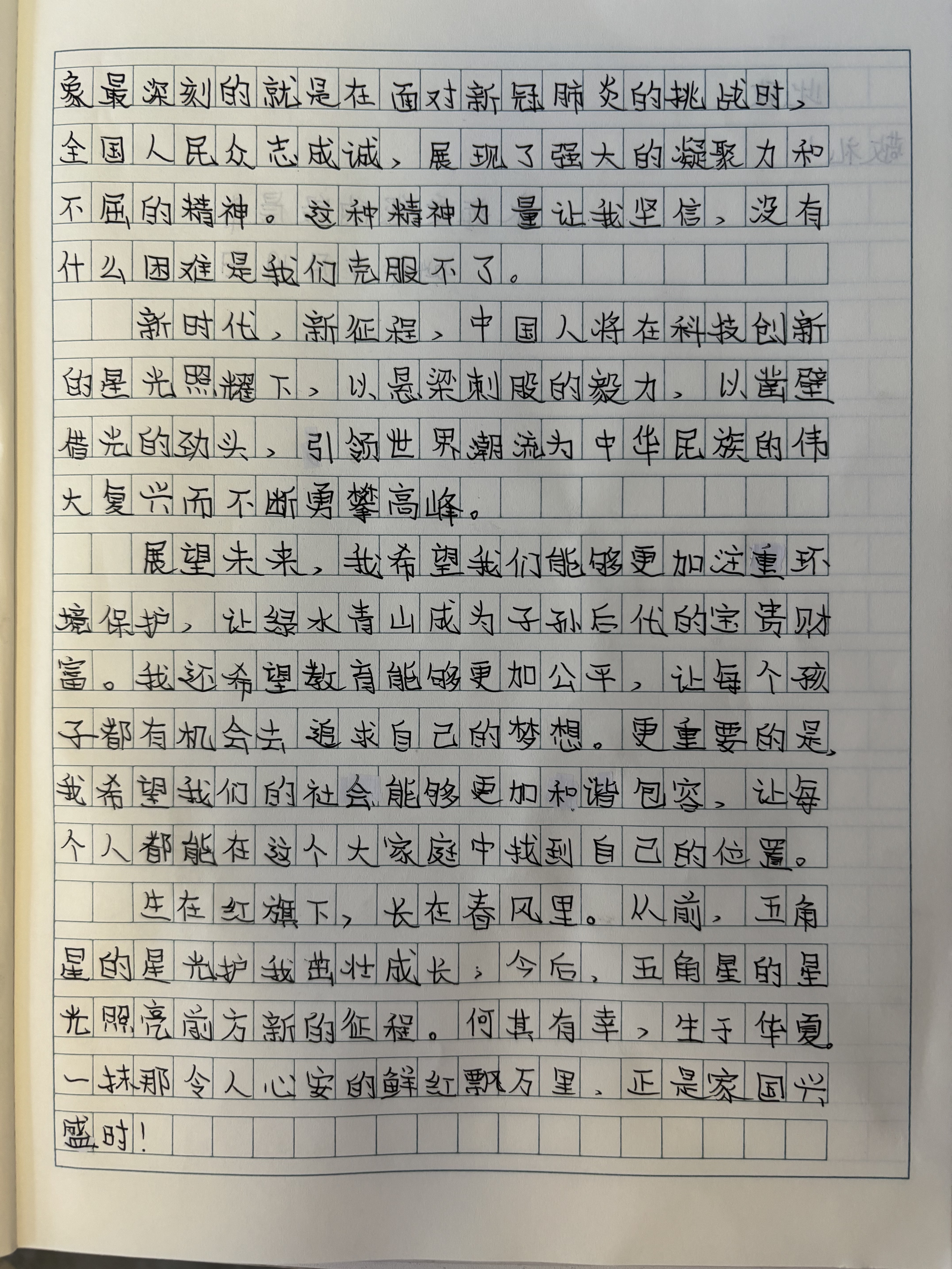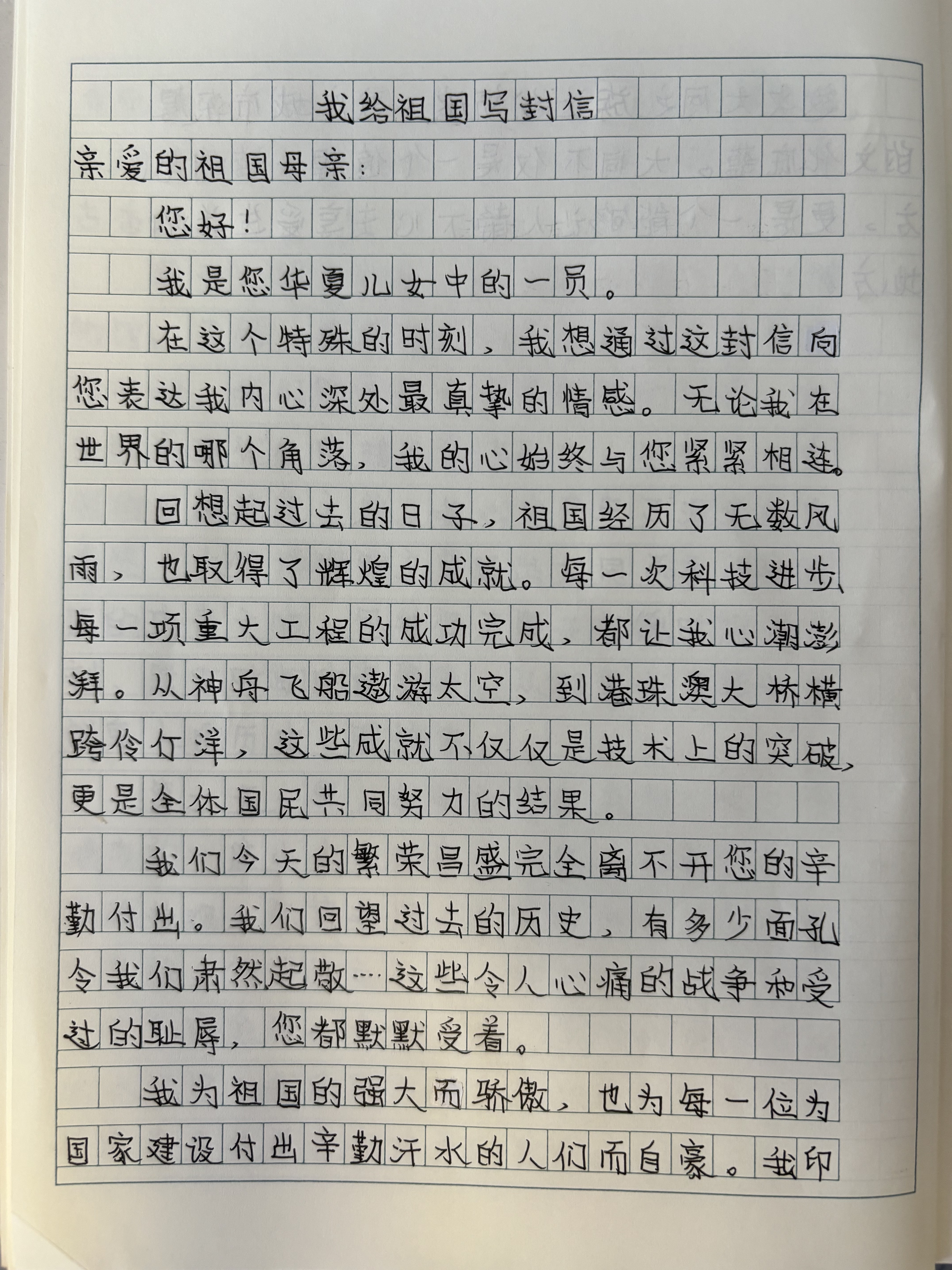今天这幅AI绘画作品的原型来自北京市朝阳区将府实验学校七年级(5)班殷晨希的书信作品《我给祖国写封信》。
