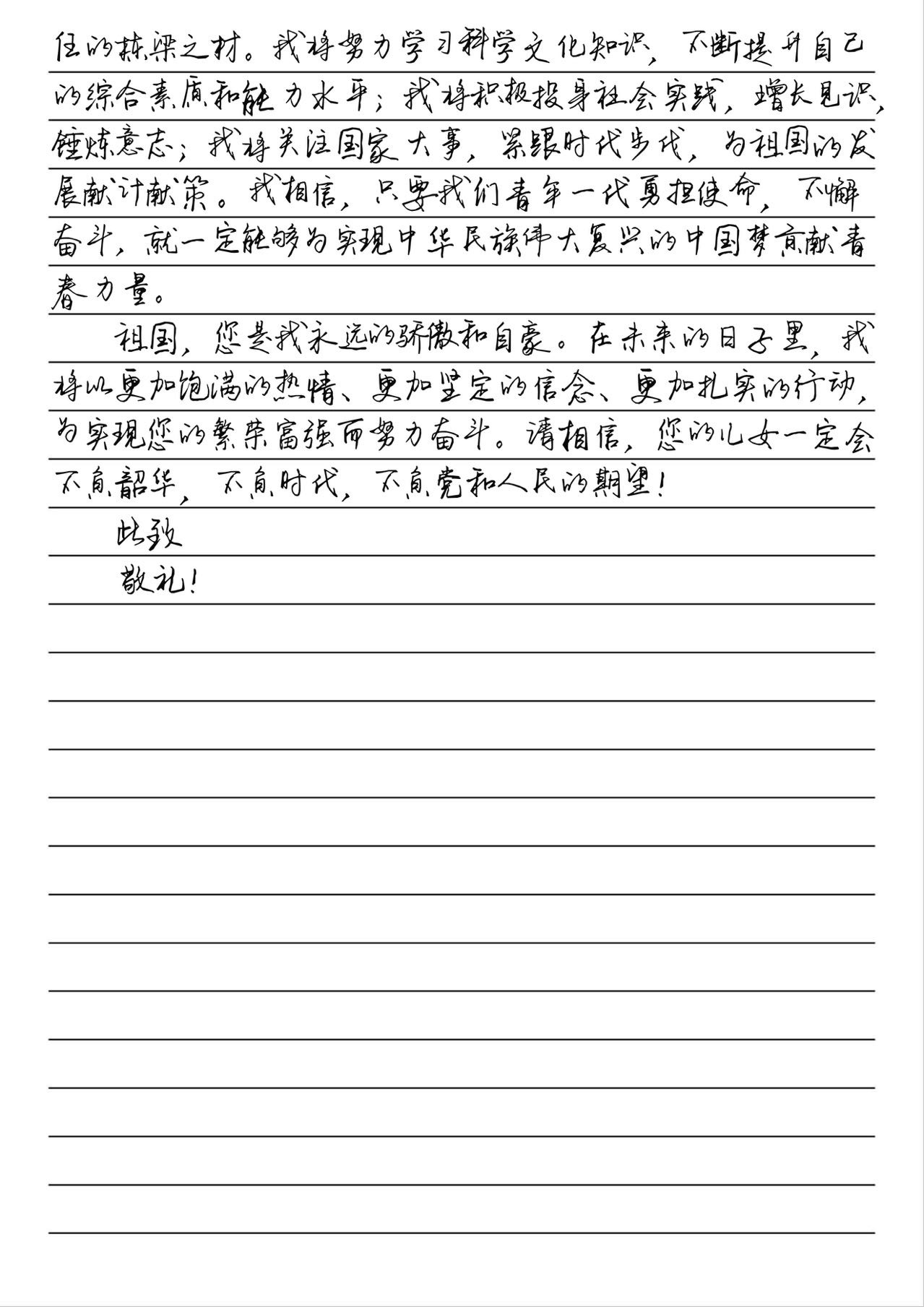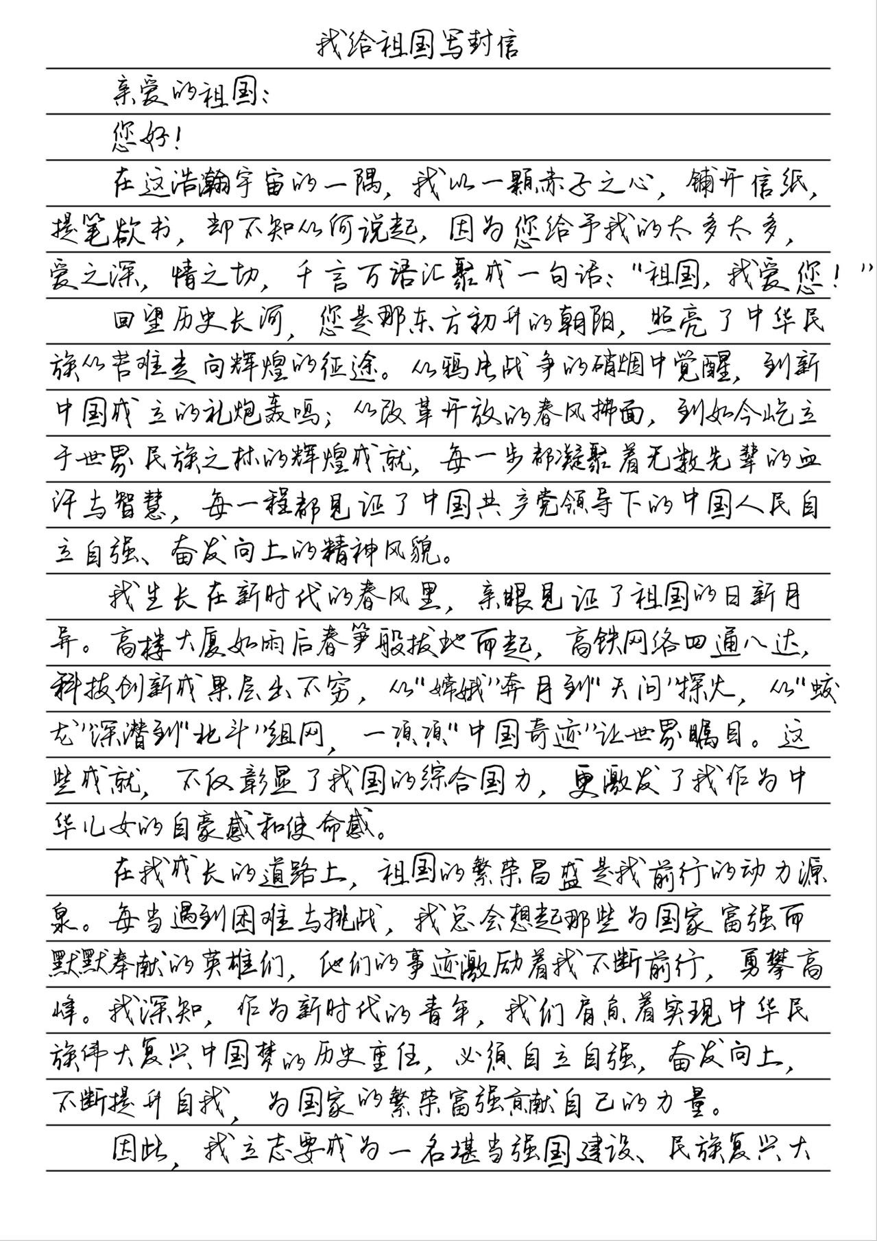 今天这幅AI绘画作品的原型来自北京清华志清中学十一年级(3)班马文焱的书信作品《我给祖国写封信》。
