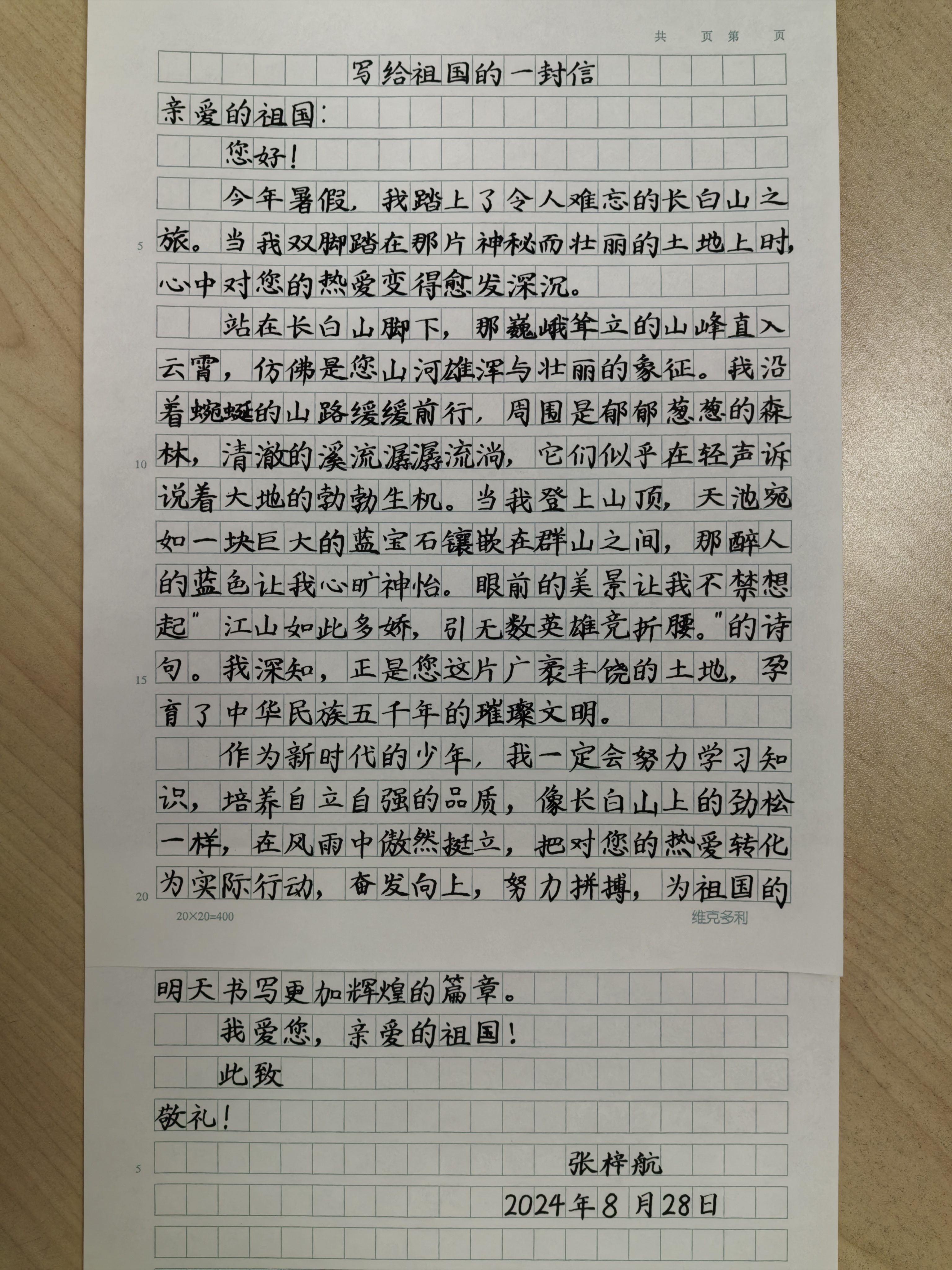 今天这幅AI绘画作品的原型来自北京市海淀区西颐小学四年级(2)班张梓航的书信作品《写给祖国的一封信》。