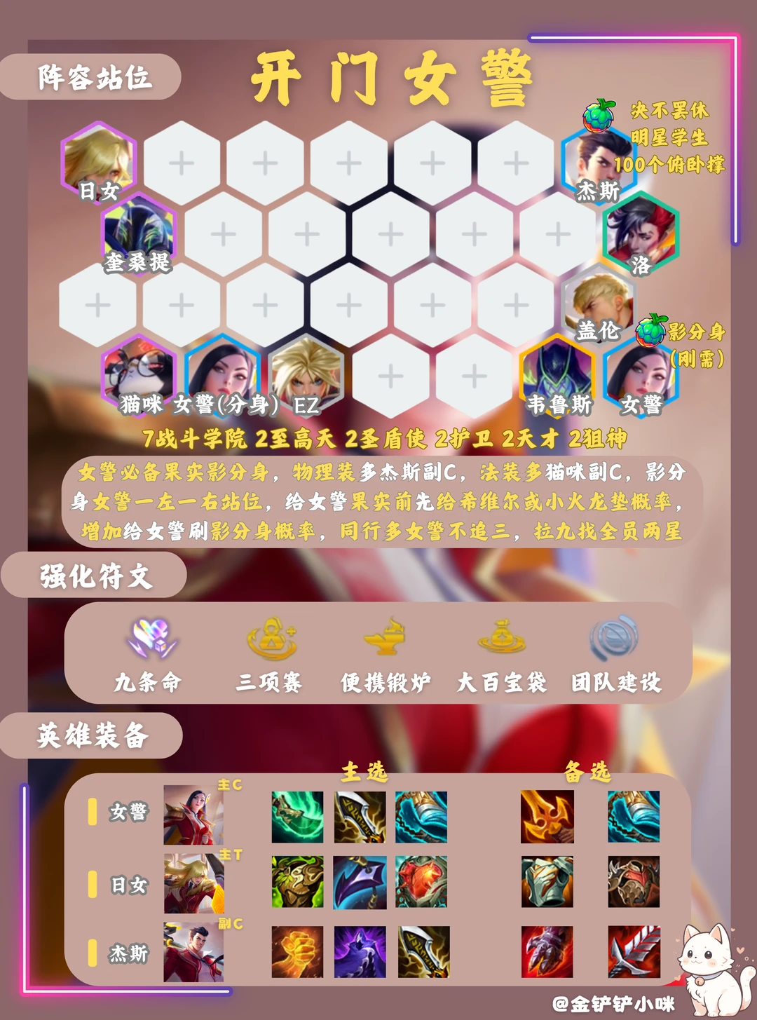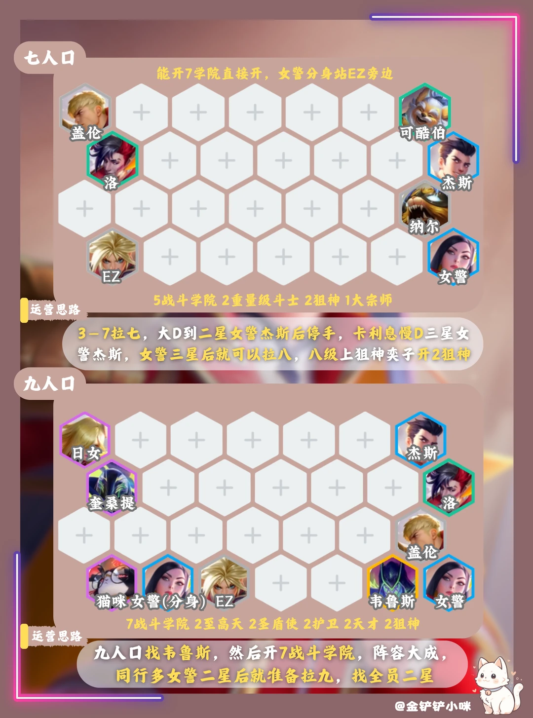 3️⃣阶段3-2拉6,3-7左右拉7,七级大D找到二星女警杰斯后,卡利息慢D三星女警,女警三星后再拉等级,如果有同行就女警杰斯二星后拉等级,上九找全员二星