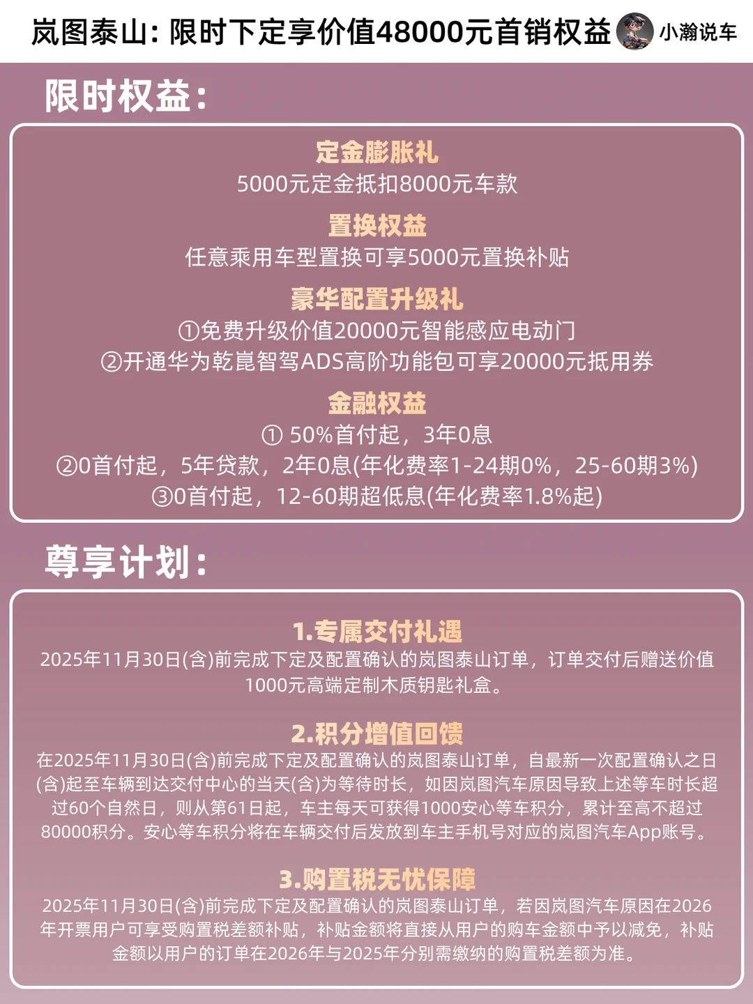 11月30日(含)前订岚图泰山,可享价值4万8的首销权益以及跨年提车的购置税兜底保障!趁截止前,快去4S店试驾锁定权益吧~