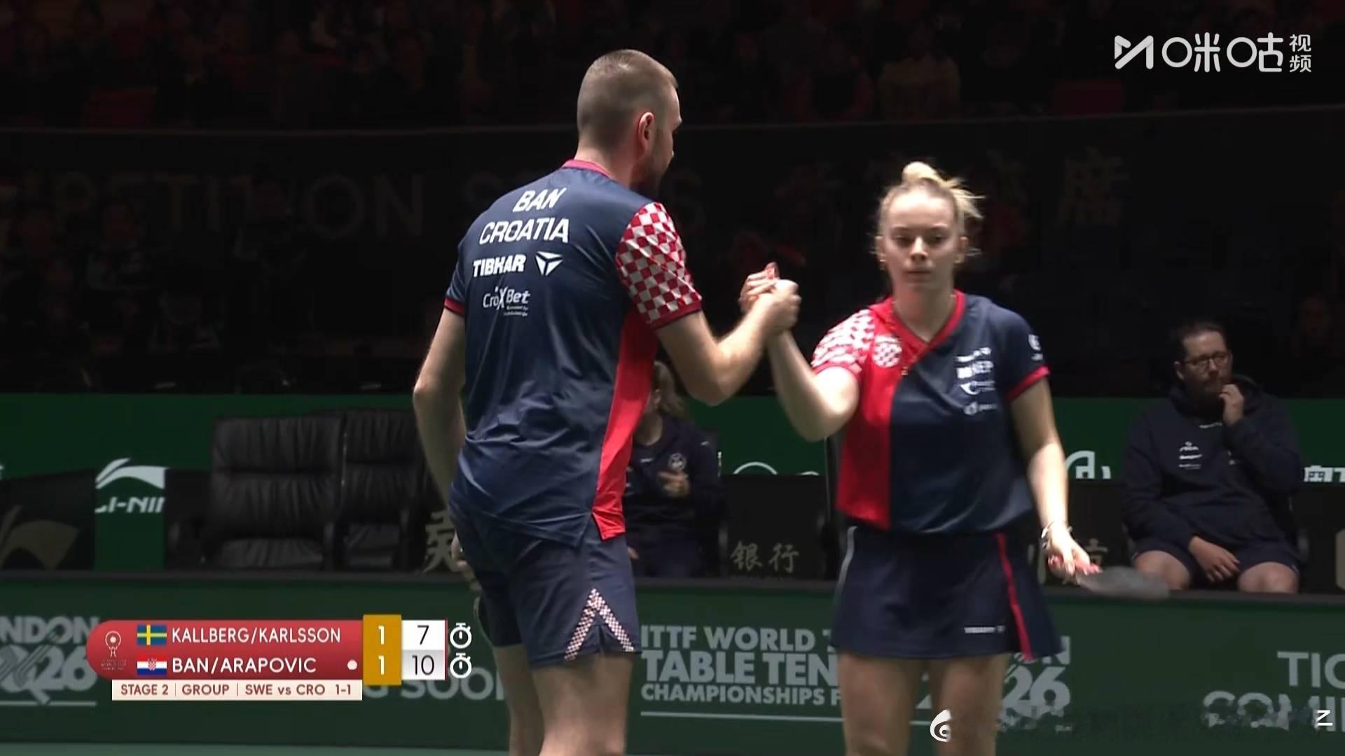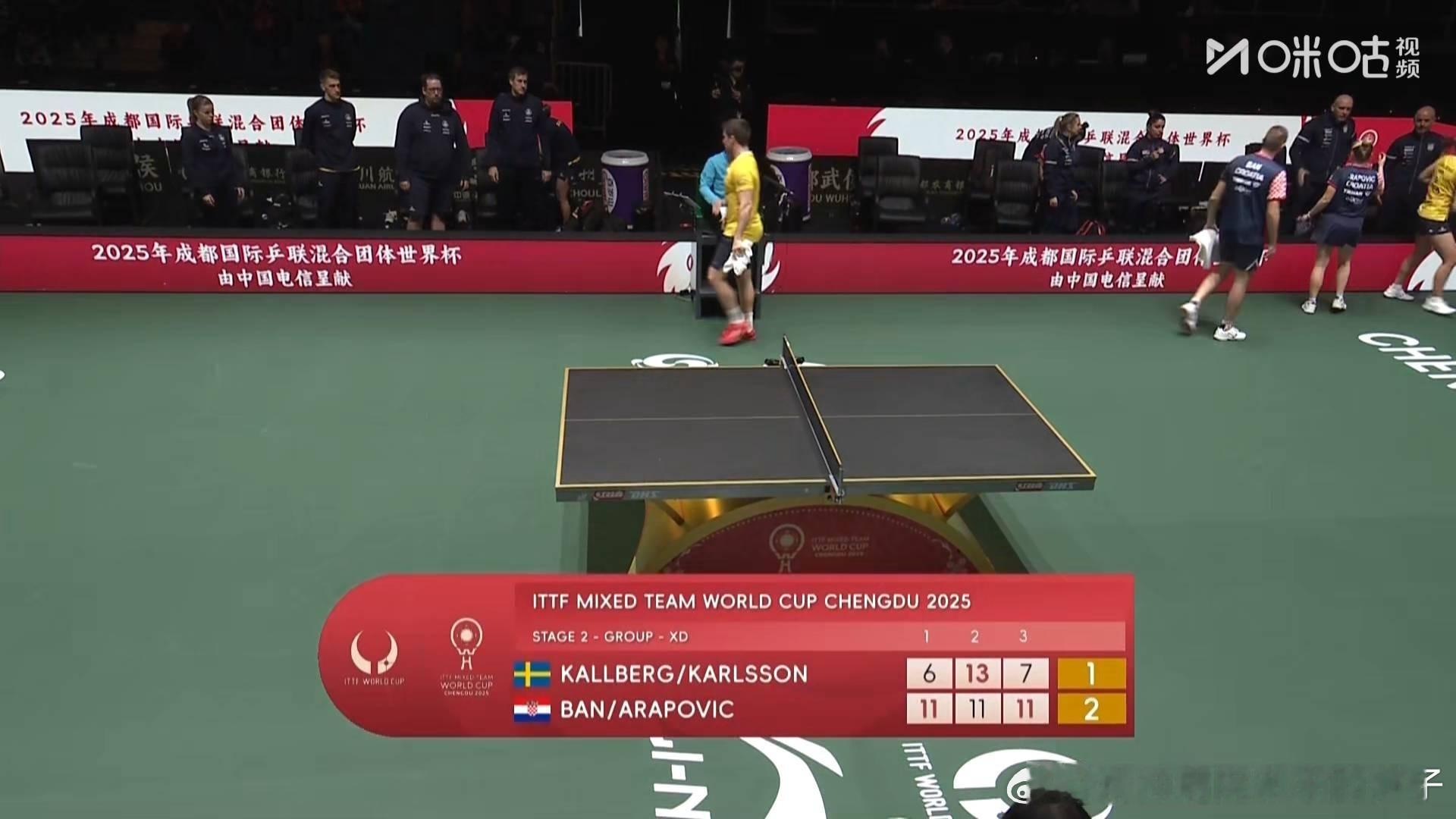 伊沃本阿拉波维奇2比1卡尔松/克里斯蒂娜卡尔伯格(6,-11,7)第二盘:拉科瓦奇VS伯格斯特隆克罗地亚队二比一瑞典队2025年国际乒联成都混合团体世界杯第二阶段