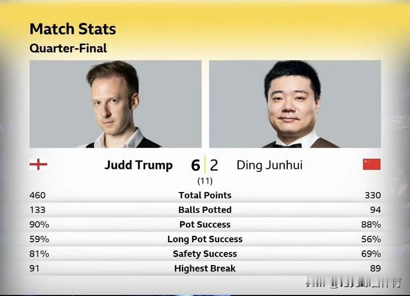 斯诺克:2025斯诺克英锦赛1/4决赛丁俊晖出局,止步八强! 北京时间12月5日晚开打的8进4比赛,全场比赛,贾德·特鲁姆普打出三杆50+(73、91、50),丁俊晖打出两杆50+(89、83)。 上半场两人战至2-2平,下半场特鲁姆普连胜三局以5-2率先取得赛点,并在第七局中完成单局逆转,第八局特鲁姆普抓住机会两度上手拿下比赛,最终,贾德·特鲁姆普6-2战胜丁俊晖,率先晋级四强。